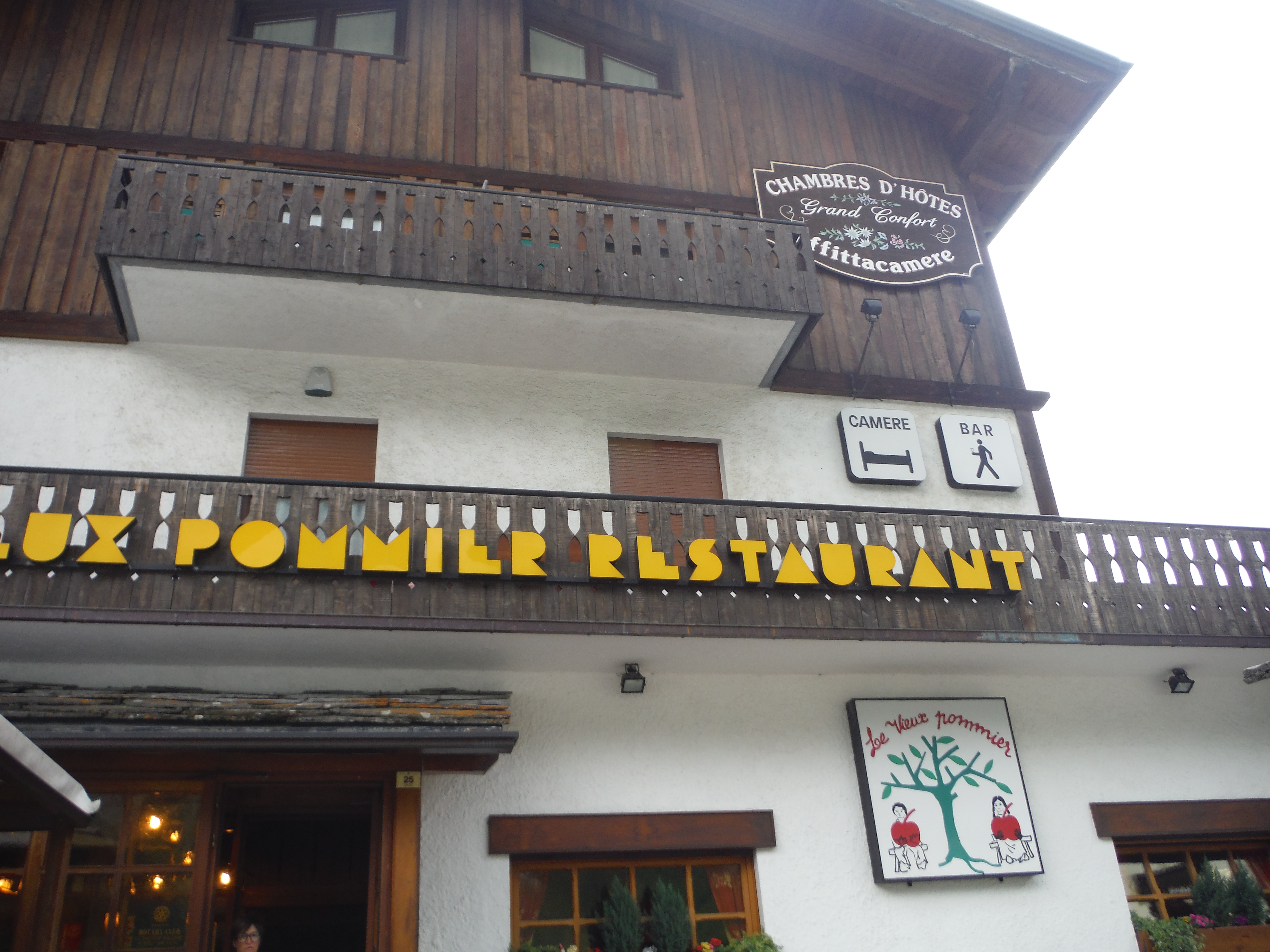 The day has really warmed up and our gear has been setting in the blazing sun the entire time we were exploring. We follow the road toward the French border and Monte Blanc and more passes. As we pass thru town and head toward the mountain passes the skies start to turn dark and menacing and it starts to rain a little, prompting us to rethink crossing the pass as we don’t want to be slowed down with the bad weather and caught on the mountain at night, maybe in snow. Since it’s already late afternoon we turn back and find a nice inn with views of Monte Blanc, with a bar and Italian restaurant. We hang up our gear to dry, get a drink and wander around town before the restaurants open at eight.