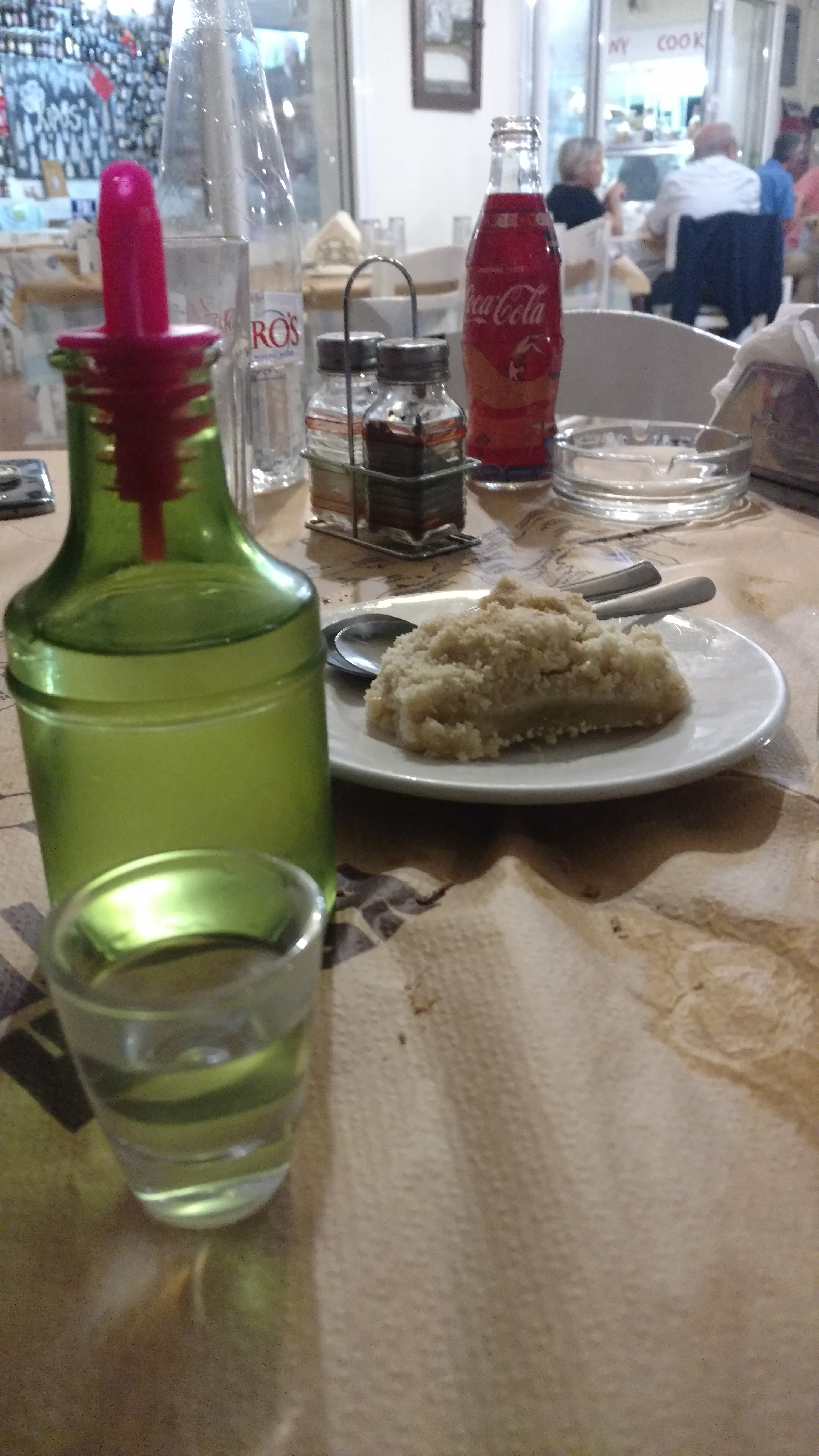 I had spotted a camping spot on a river just off the Mediterranean, the Camping Agia Galini. After arriving we set up camp and headed for the pool for a quick dip to cool off. Walking across the bridge we headed into town which had several little shops and restaurants where you could kick off your flip-flop and dig your toes in the sand as you ate dinner on the sea. There was to be a live classic rock band that night at one of the places, so we decided to come back for dessert and drinks. While eating dinner we started talking to a couple from the US that live in Greece now. They told us we didn’t act like the typical Americans. After dessert the waiter brought us a carafe of Raki and two shot glasses, a Greek way of saying Thank-you. It was a very relaxing and enjoyable evening.