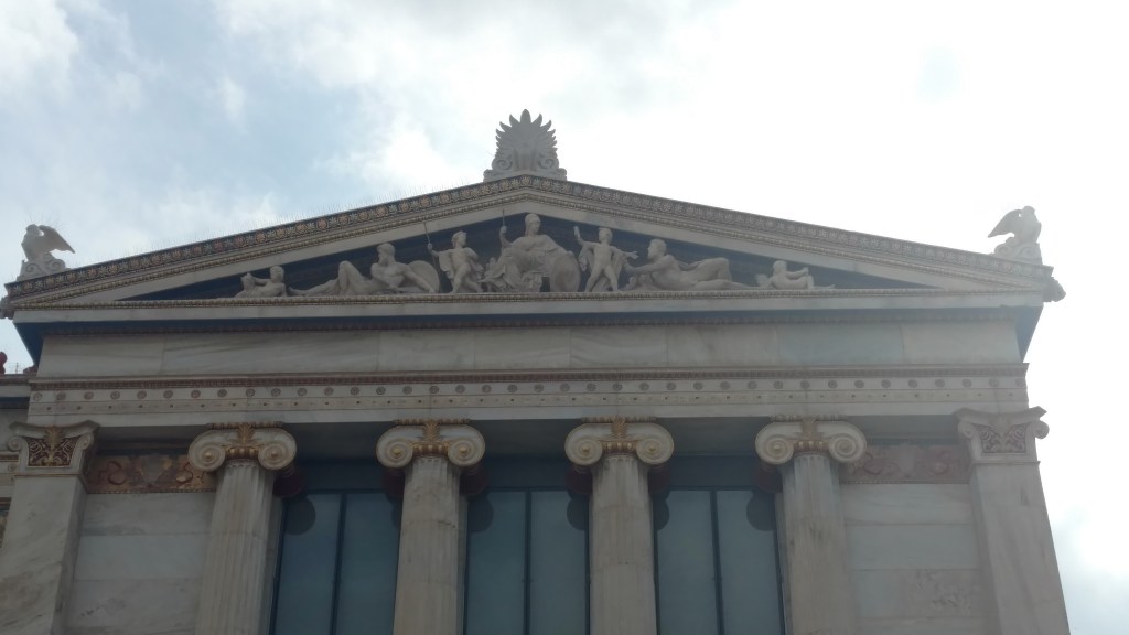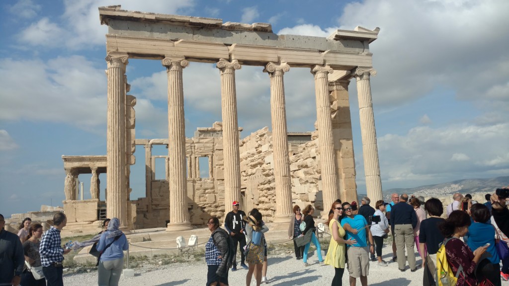 In the morning we walked to the pickup location for the bus and rode a big loop to see the sights before deciding which place we wanted to see first. From many areas in the city all you have to do is look up and on a an enormous flat rock 490 feet above and overlooking the city is the Acropolis of Athens. This ancient citadel was built in the 5th century BC. The area contains several ancient buildings of great architectural and historic significance, the most famous being the Parthenon. The Parthenon was dedicated to the goddess Athena, whom the people of Athens considered their patron. The Acropolis is undergoing extensive renovations at the present time.