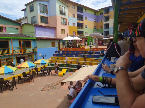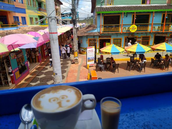 We found a hotel with a hot tub between the two tourist areas. After checking in and a quick soak in the hot tub, we hailed a tuk-tuk into town. Cost was a little over one US dollar. Guatapé is a very touristy village with a beautiful square. The roads are full of colorful trinket and coffee shops, and restaurants with small tables lining the sidewalks, shaded from the sun by umbrellas.