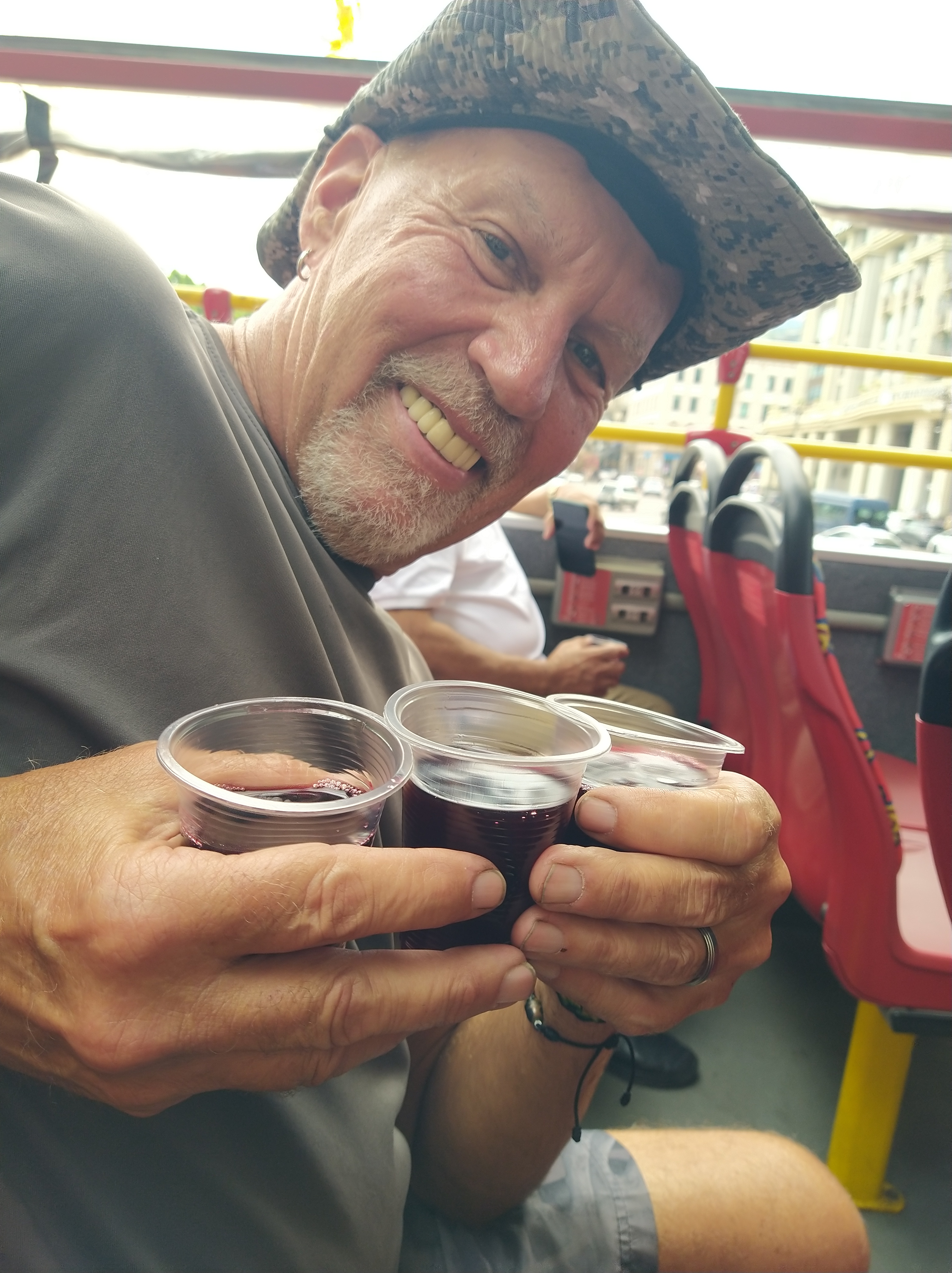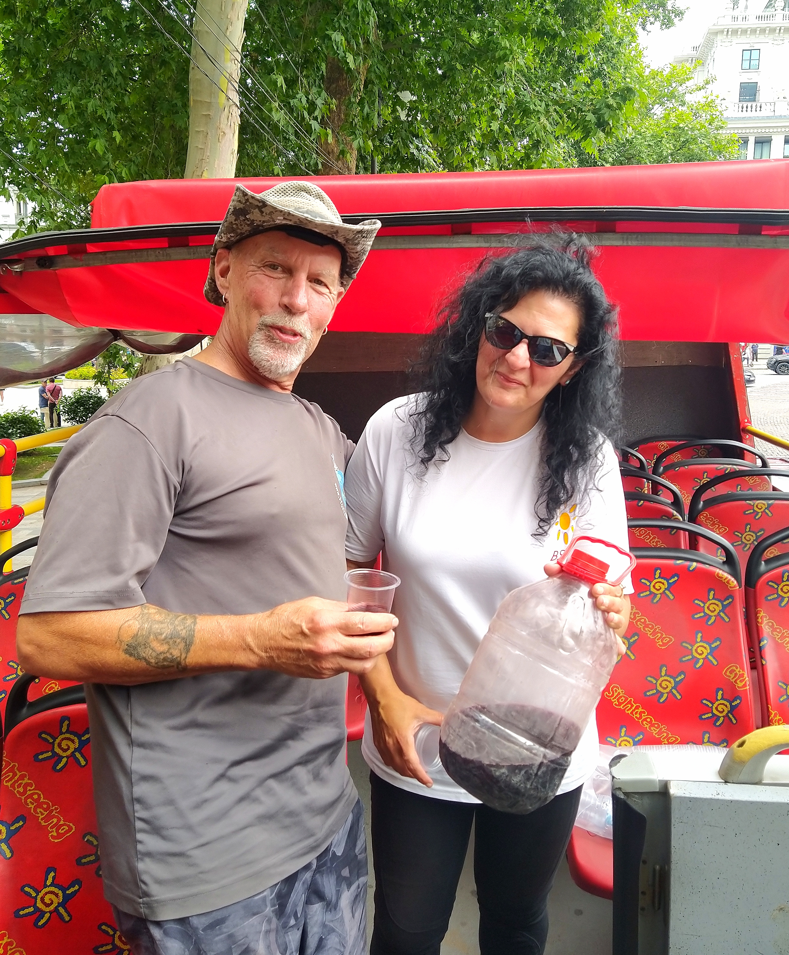 When we get to big cities and want to see the sites we sometimes look for a HOHO, a hop on – hop off, bus that will take you to see the sites. We found one here advertising Free Water, Free Wine, Free Coffee, Free Tea and Free Chacha, a tasty high alcohol vodka. The tour guide would walk around the bus getting you whatever you wanted and she was hilarious.