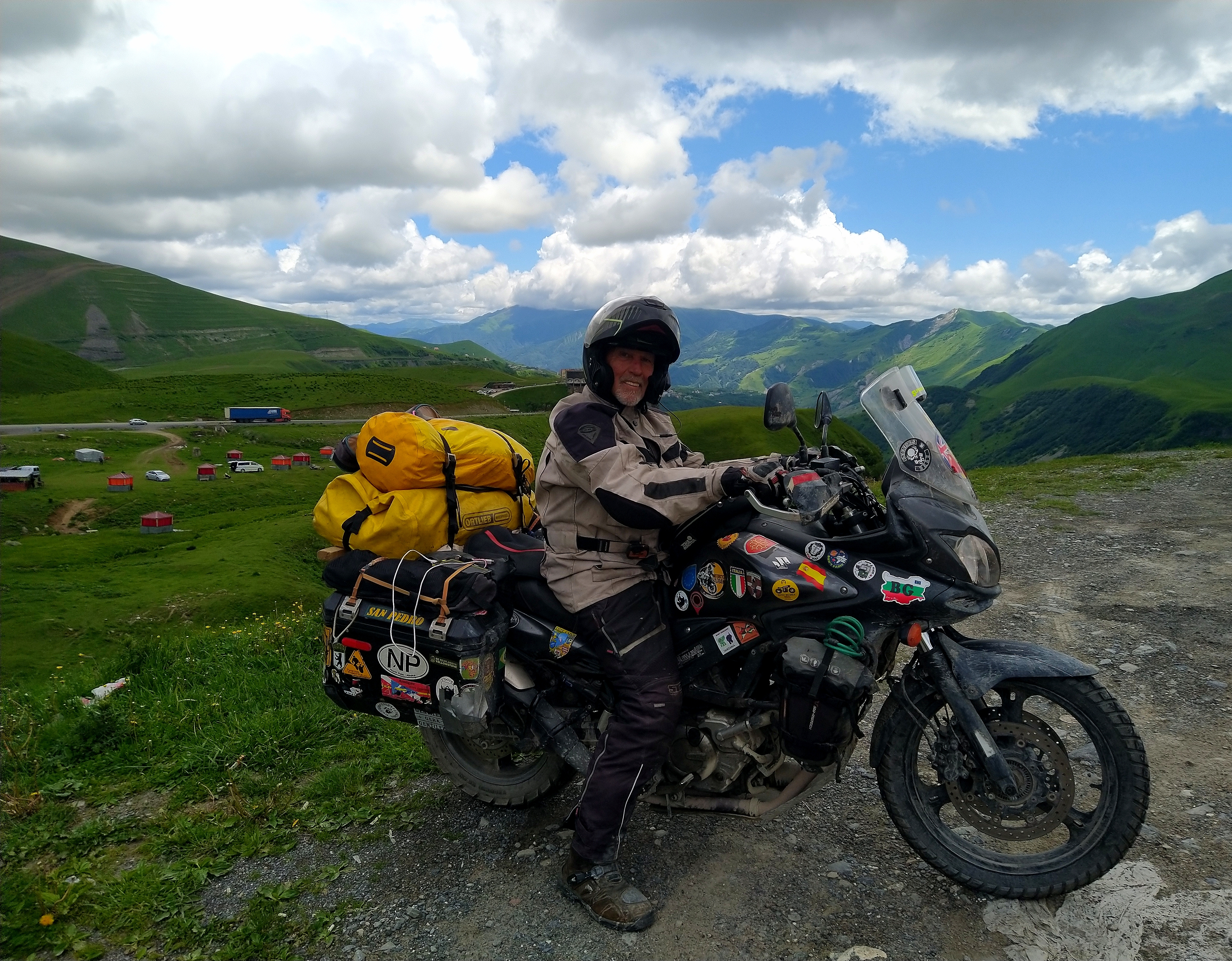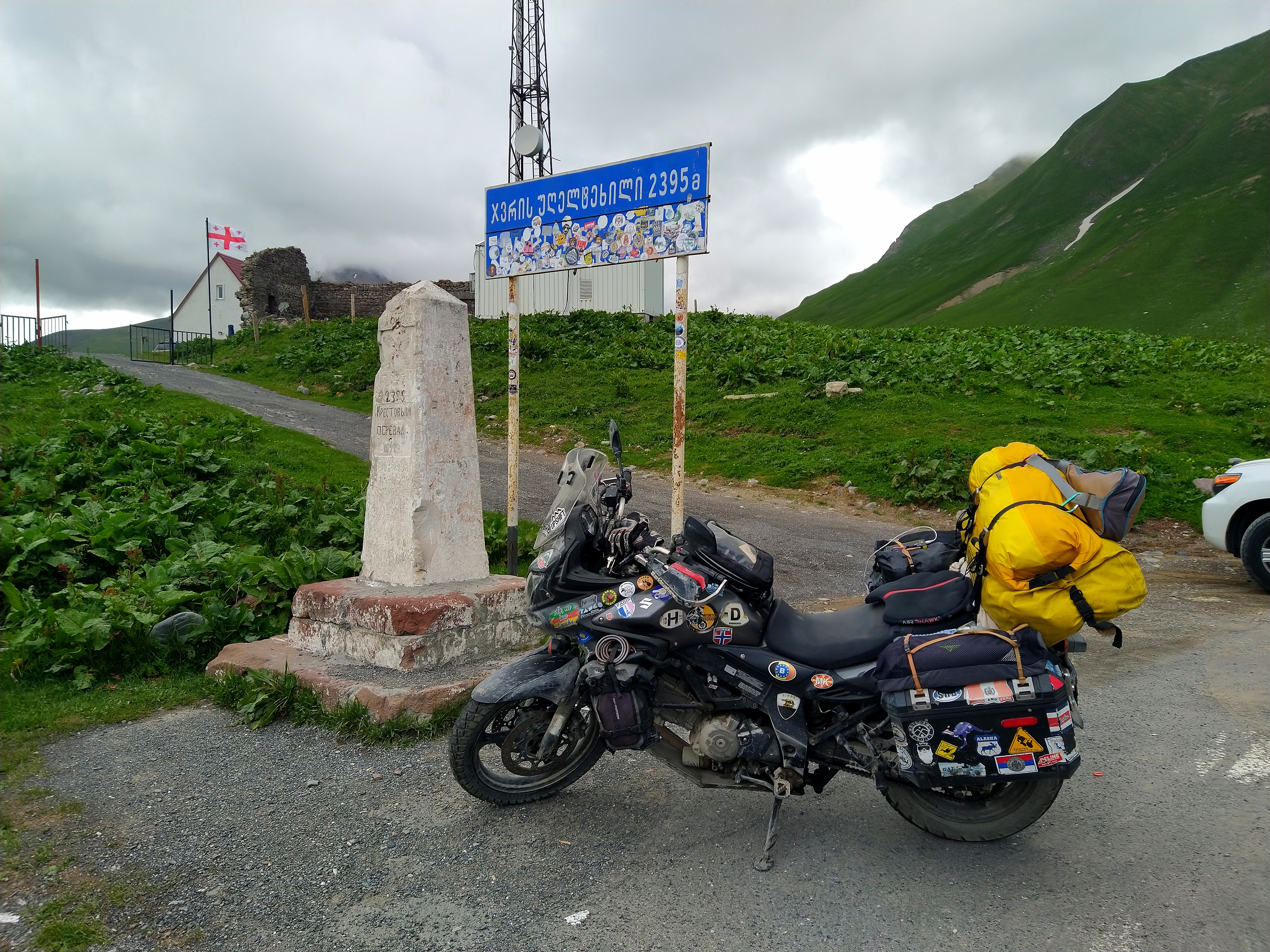 Leaving Tbilisi, we headed north through the Tbilisi national Park. The maps we have show a beautiful curvy road through the mountains. The road is mostly tar with broken areas of dirt. It connects to the Georgia military highway. We are headed north on the Georgia military highway. This highway, between Tbilisi, Georgia and Vladikavkaz, Russia, is the traditional route used by invaders and traders throughout the ages. It runs through a gorge surrounded by high mountains. The one pass on the highway, the Jvari Pass, reaches a maximum altitude of 7,805 feet (2,379 metres).