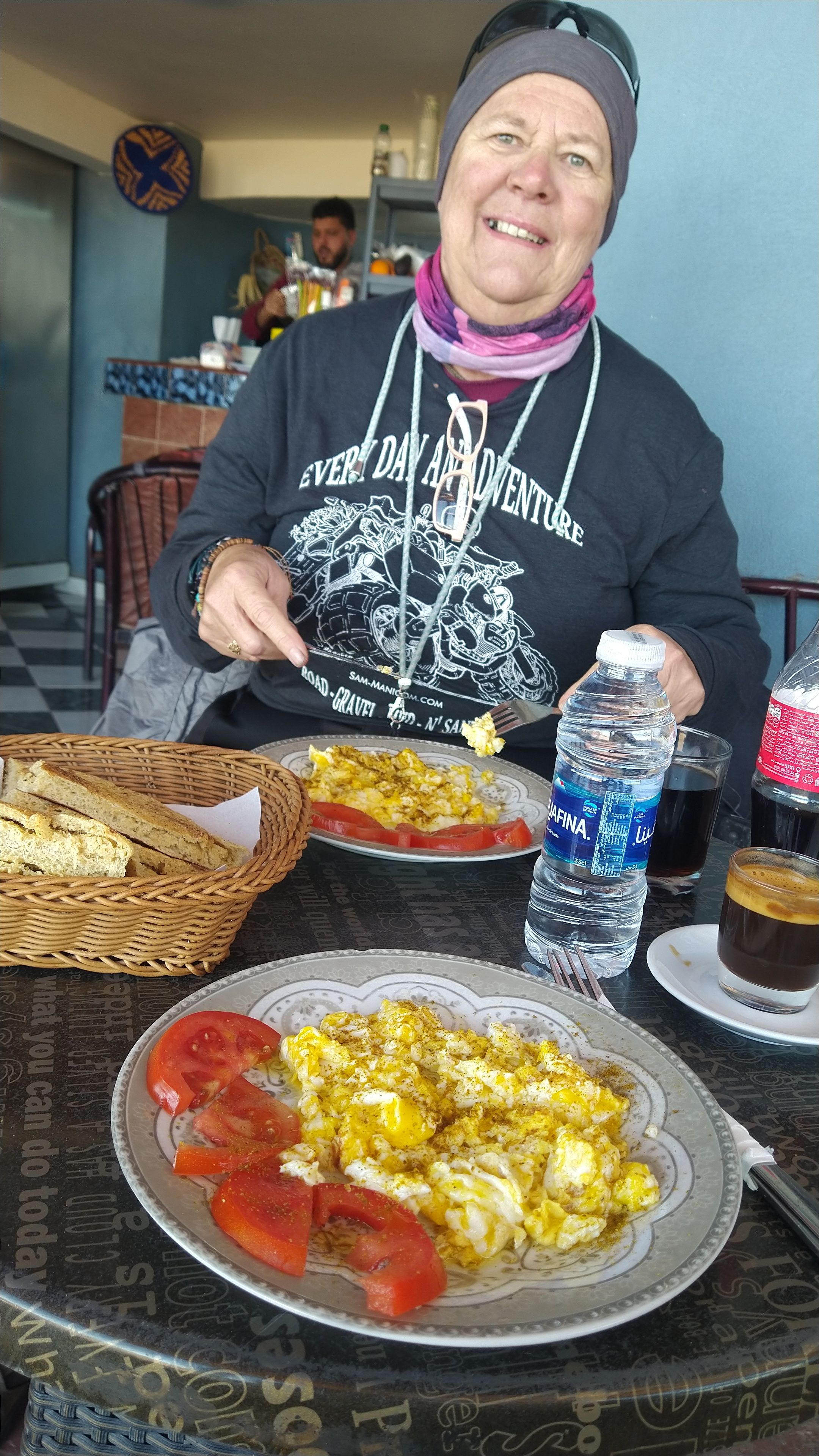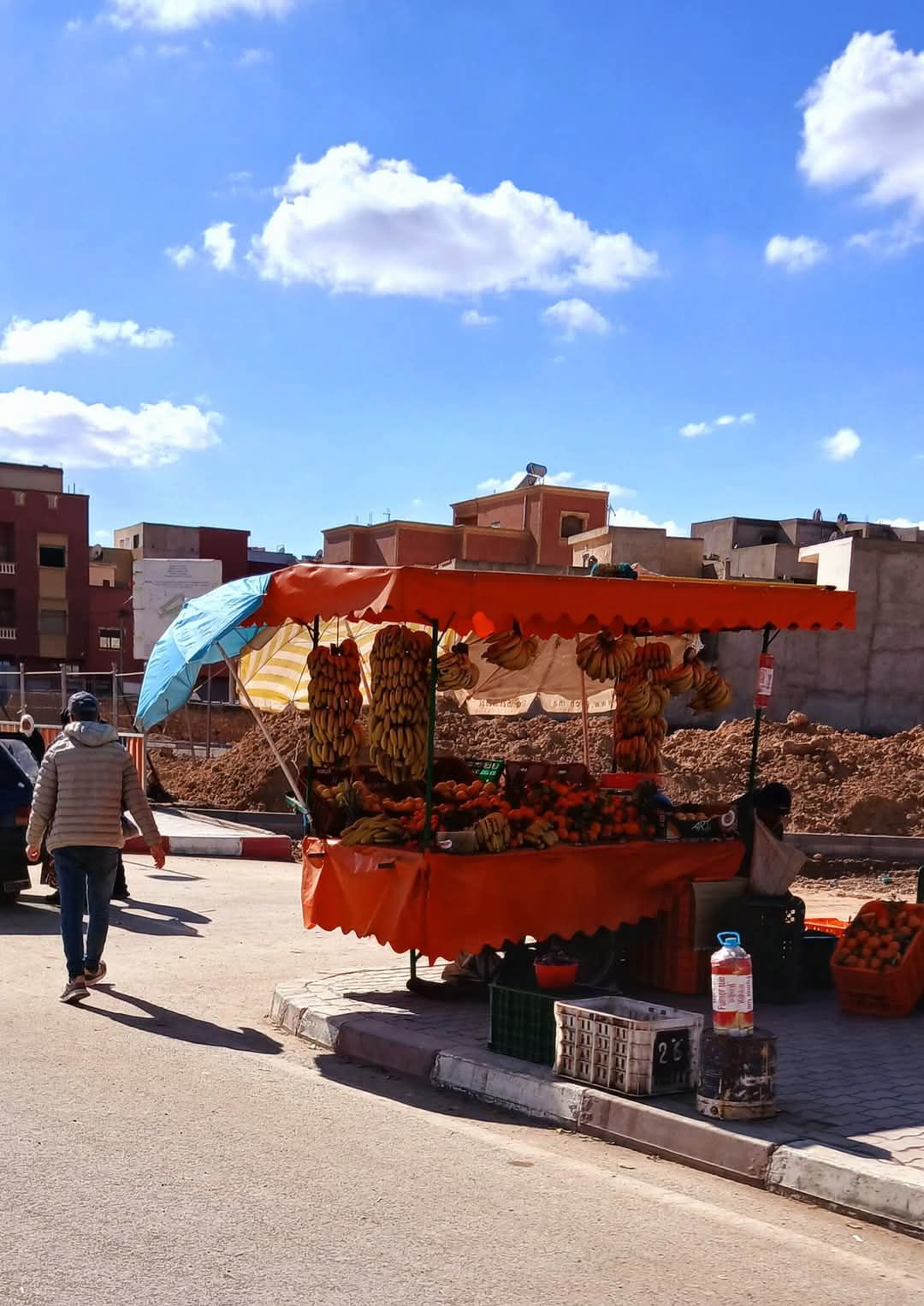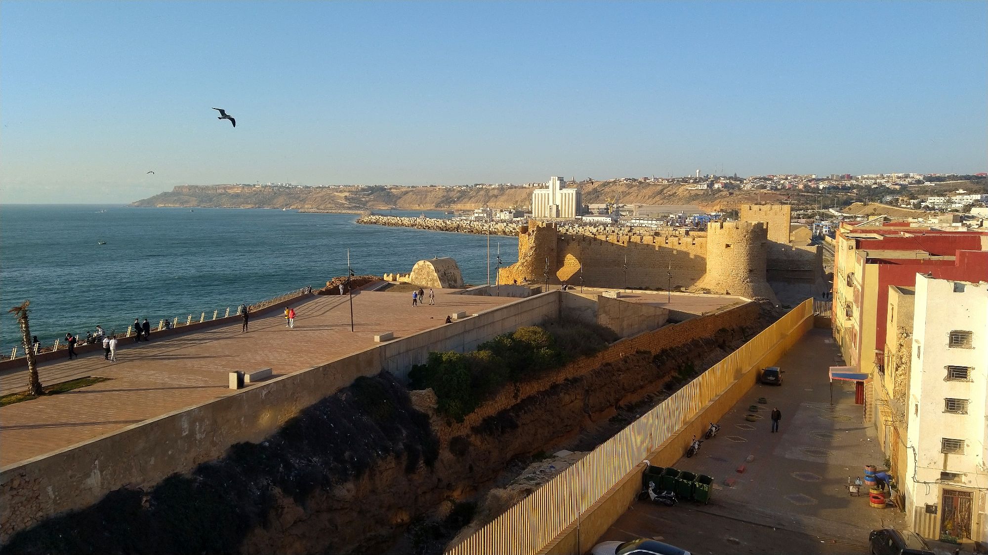 It was another beautiful day of bright blue skies. As we made the turn towards the coast the number of camper vans from mainly France increased. This area seems to be a winter playground for many in Western Europe. Camper vans are parked on the street and line the rocky bluffs overlooking the Atlantic. We had found an apartment on the main boardwalk in Safi. It had a beautiful open area right on the Atlantic beach. At one end was an old Portuguese fort and a marine port. The fort was closed to tours. Large ships laden with cargo, possibly oil and phosphorus, were waiting a turn off the coast. Each one would come to the docks to be unloaded onto a waiting train. Once loaded with a precious cargo the train would huff and puff toward town. Once reaching the boardwalk it would disappear under the concrete to some waiting distributor. After sunset, the boardwalk would become a playground for many families. Couples also enjoyed walking and sitting during the day. As sunset approached vendors started bringing food carts and play toys to the boardwalk. We had found a small restaurant on the fourth level of a building overlooking the boardwalk in Atlantic for dinner. The young girl who waited on us spoke very good English. Turns out Maryum was 22 years old and was a English literature major at university in Agadir. She had taken this job as manager of this restaurant, Le Rooftop Restaurant. Smiling proudly she told us of what she had achieved thus far in life. Maryum wanted to travel. While working here, she was trying to figure out what to do with the rest of her life. She had a bubbly smile and great personality and I’m sure we’ll go far as she follows her dreams. We were back at our room for a beautiful sunset. The glow on the boardwalk slowly changed from the sun to the electric lanterns. The little electric vehicles had multicolored lights that made for a party atmosphere. Children of all sizes were writing them while parents strolled or watched. Some even had a makeshift football game going on with the children. It was very heartwarming to see this.