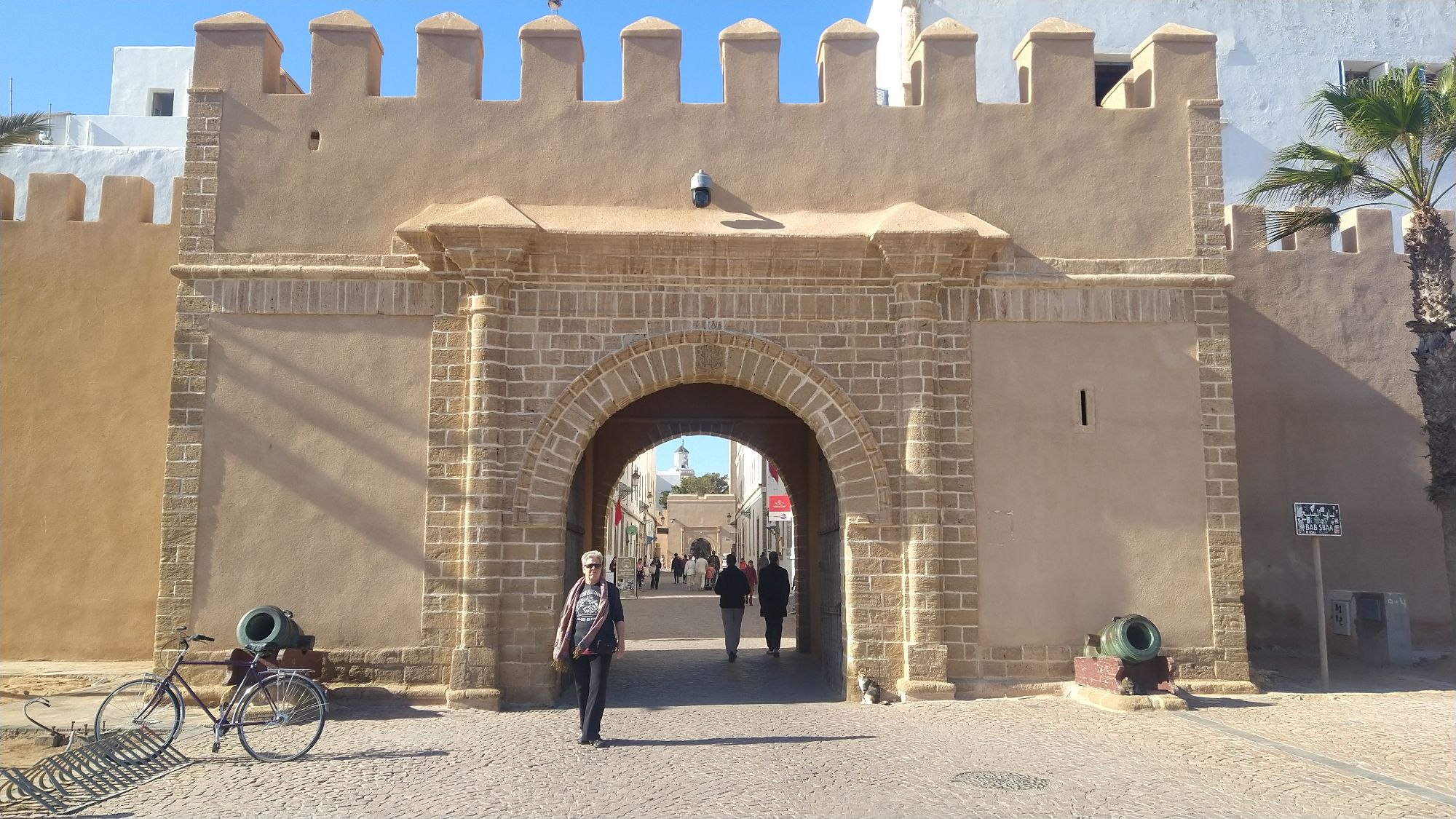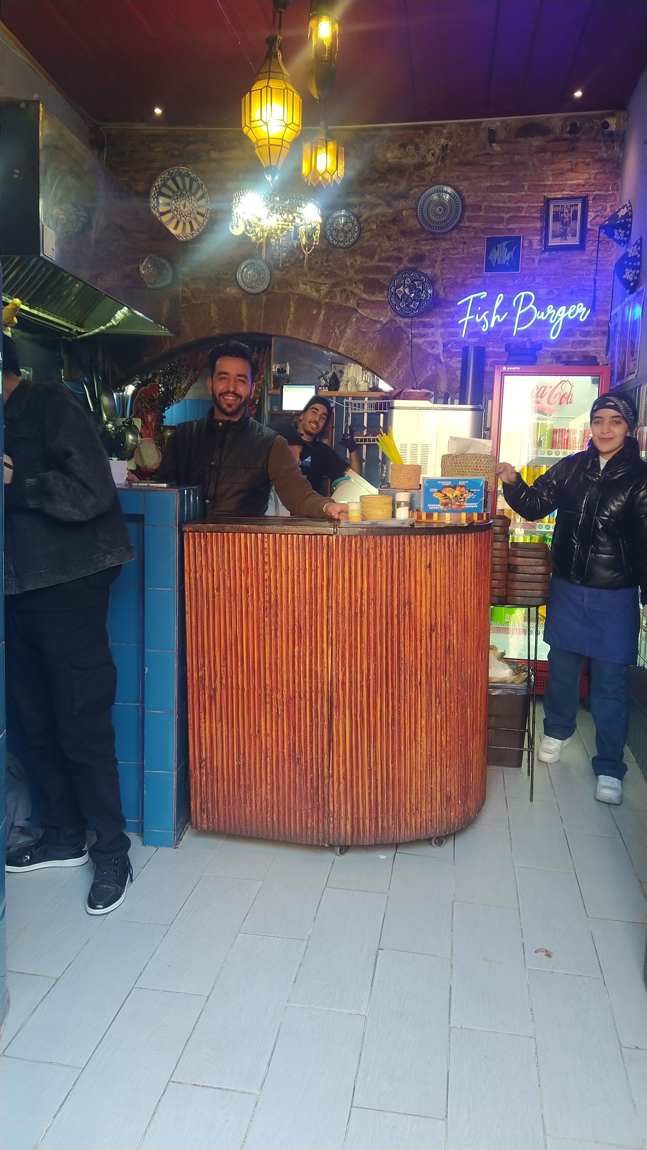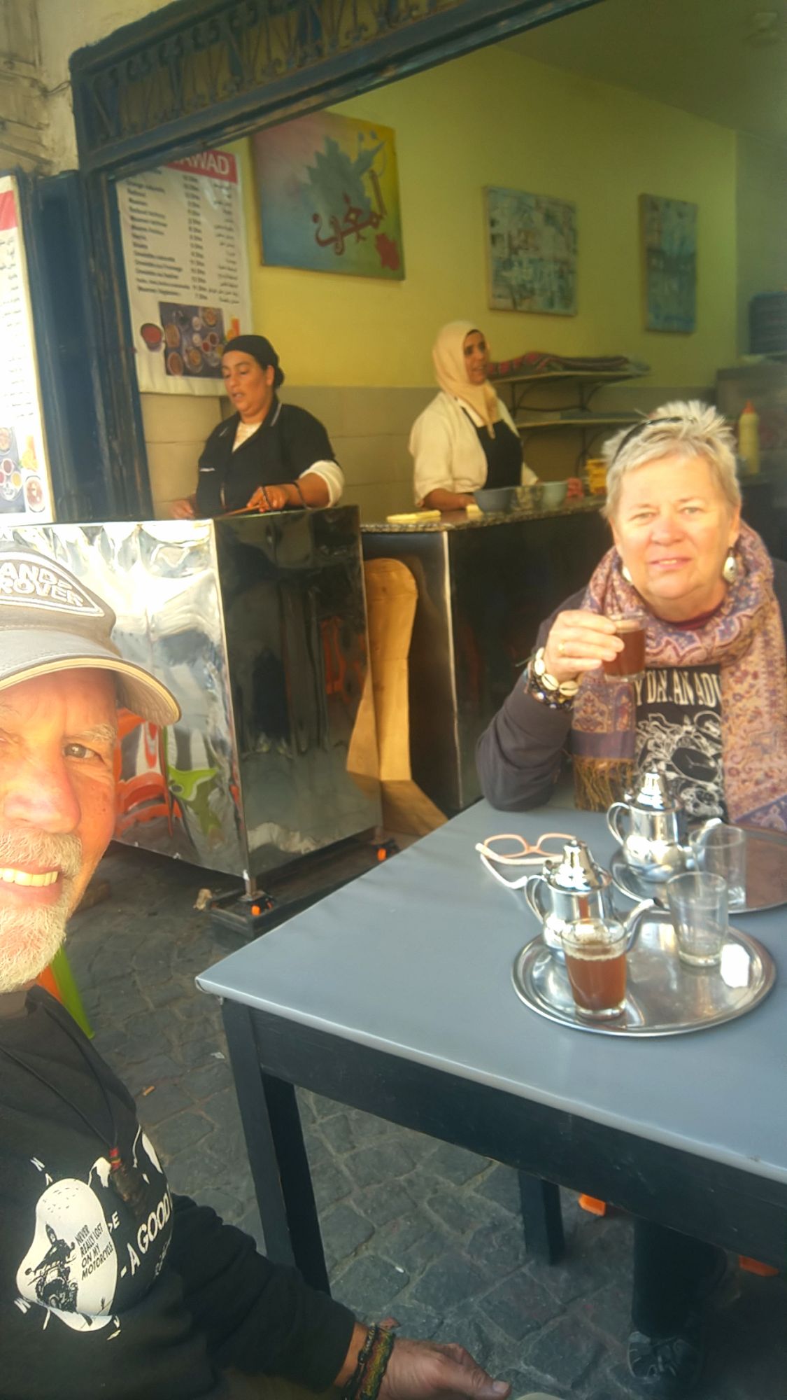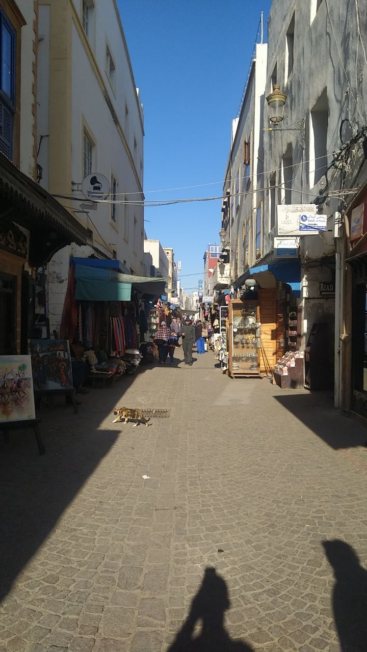 We arrived to Essaouira and found a hotel a couple miles from the kasbah and medina. Our hotel was on one end of a beautiful crescent shaped beach. It had a wide boardwalk leading to the medina at the other end. Along the way we met walkers, sun-worshipers, kite-surfers and camel riders. The market area was a maze of narrow alleys filled with vendors. We found an ice cream vendor and then wandered into a silversmith shop to barter over a pair of earrings. Bartering is a way of life here. It’s like an insult to the local not to participate. It’s all done with a friendly banter, takes time, and usually involves tea. It went something like this. Me: how much? Vendor: 1,000 (Dirham). Me: Free. We both laugh and have tea. Vendor: 500. Me: 50. This goes on with good natured banter until we agree on a price. This time is was 160 dir (about US$16). Then Melanie found a man from Senegal making jewelry. His name was Simba. We bought a colorful bracelet as a wearable souvenir of the area. Later we found a cafe and sat to just people watch as the shadows started to grow. Finally a quick dinner of a fish sandwich and fish and chips at Fishburger Essaouira.