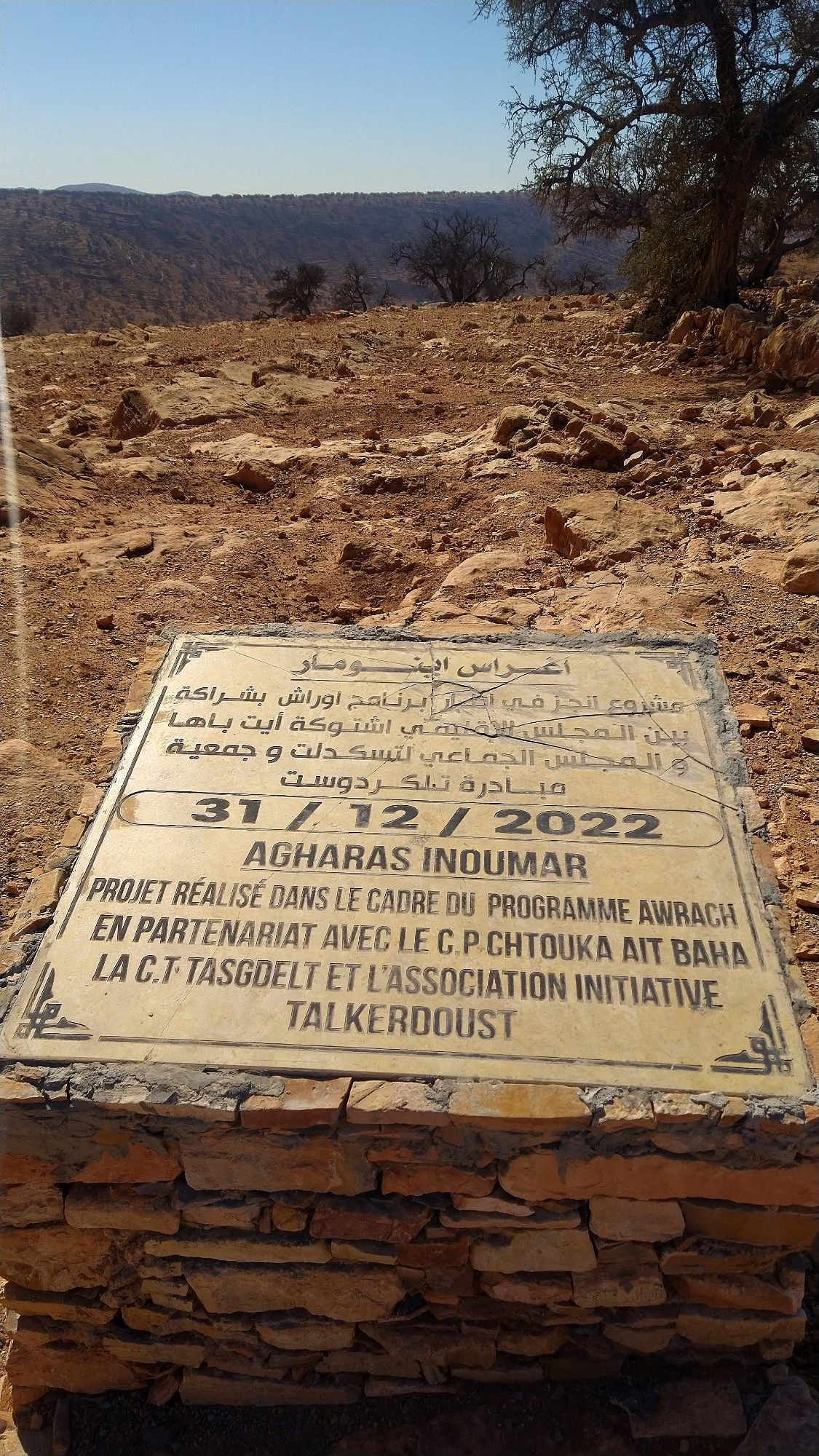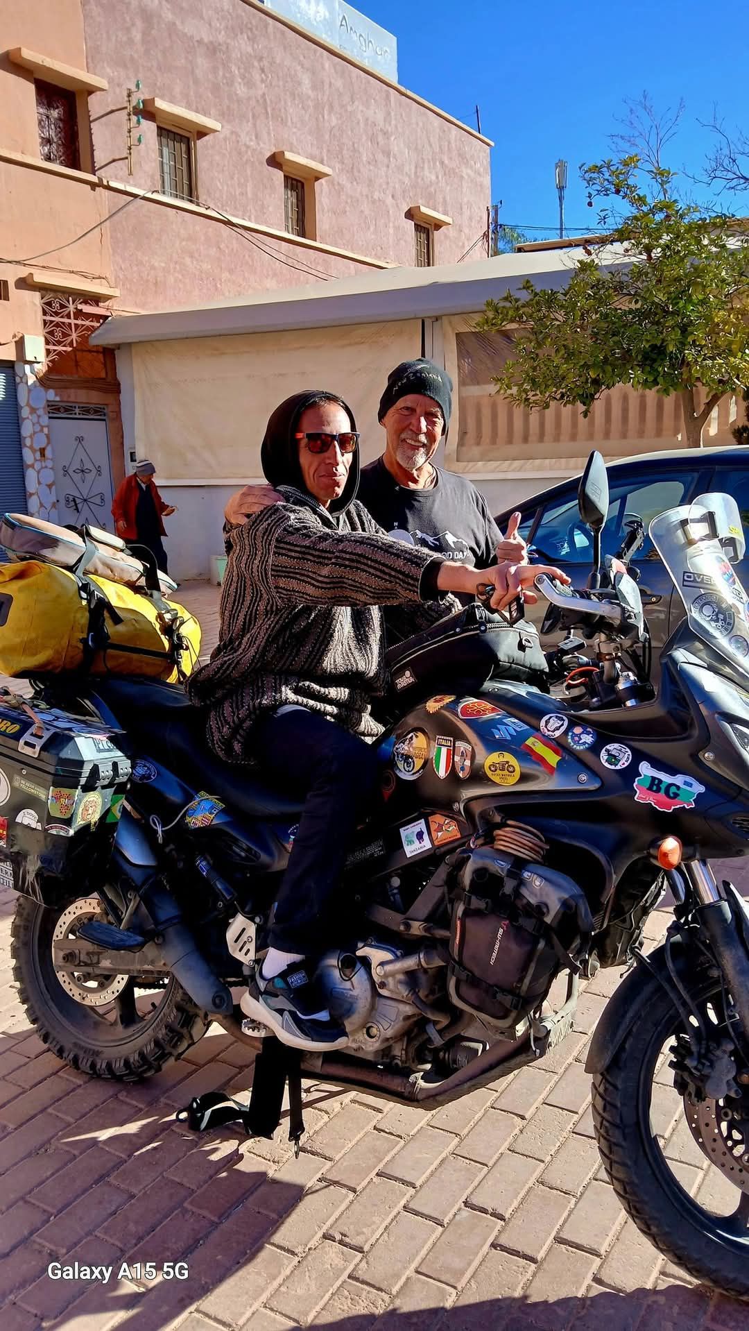 We arrived for the night in Tafraout. Finding a small hotel we had to wait for someone to show up to check in. Abdullah greeted us and welcomed us to his hotel. He found a great room for us and showed us a place to get something to eat down the street. The next morning we were chatting with him. He told us that we were the first Americans to have ever stayed at his hotel. We gave him a sticker and he was just beaming. He wanted pictures on the motorcycle.