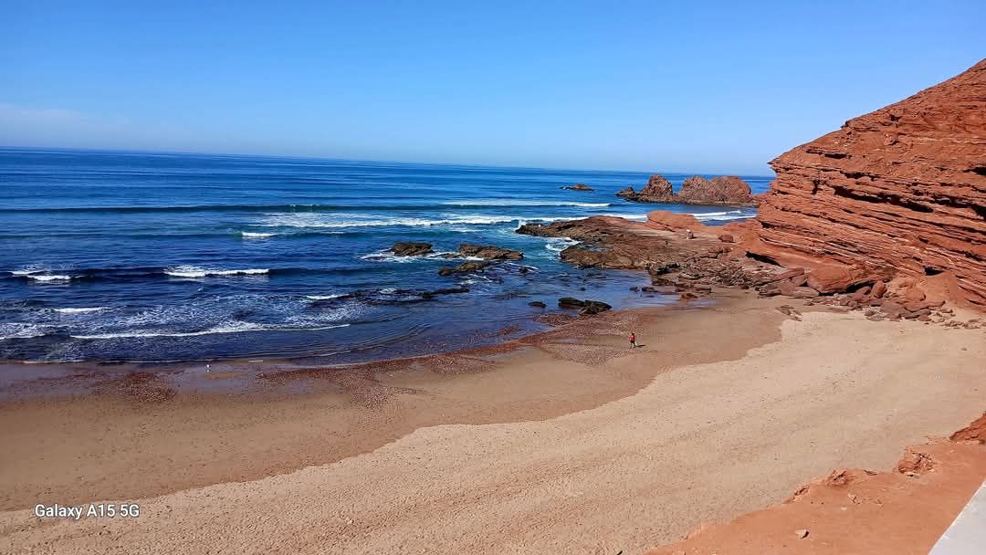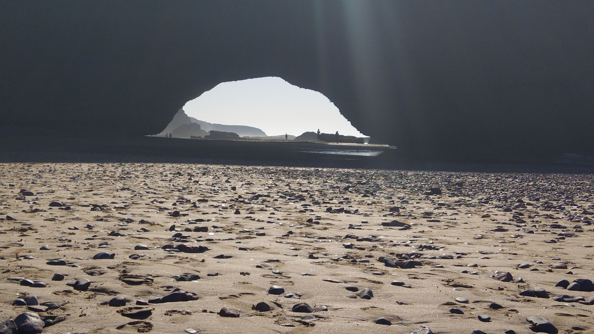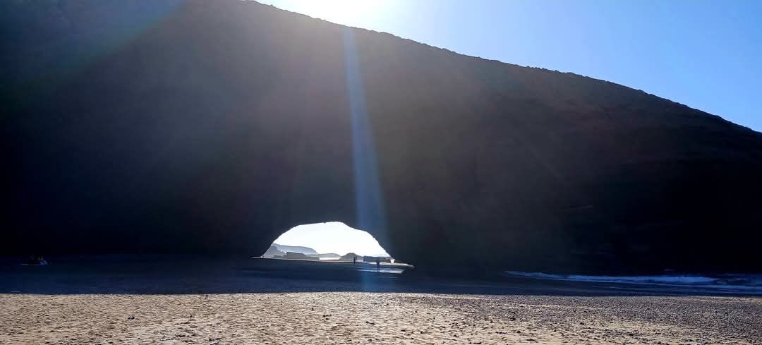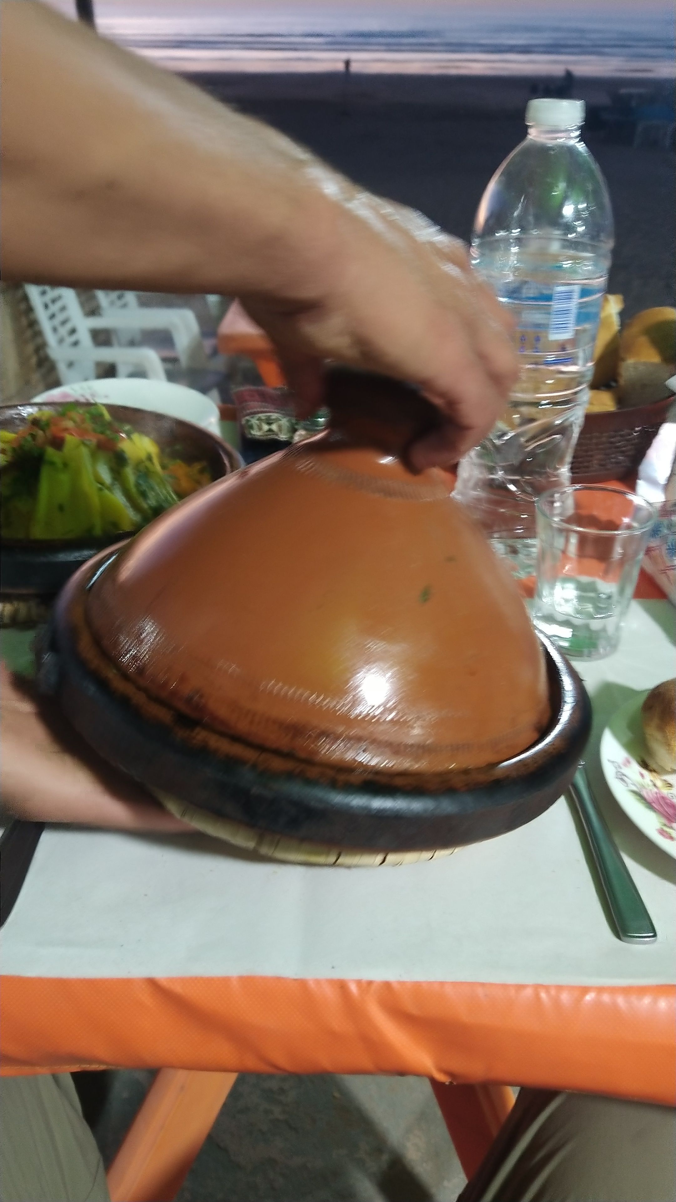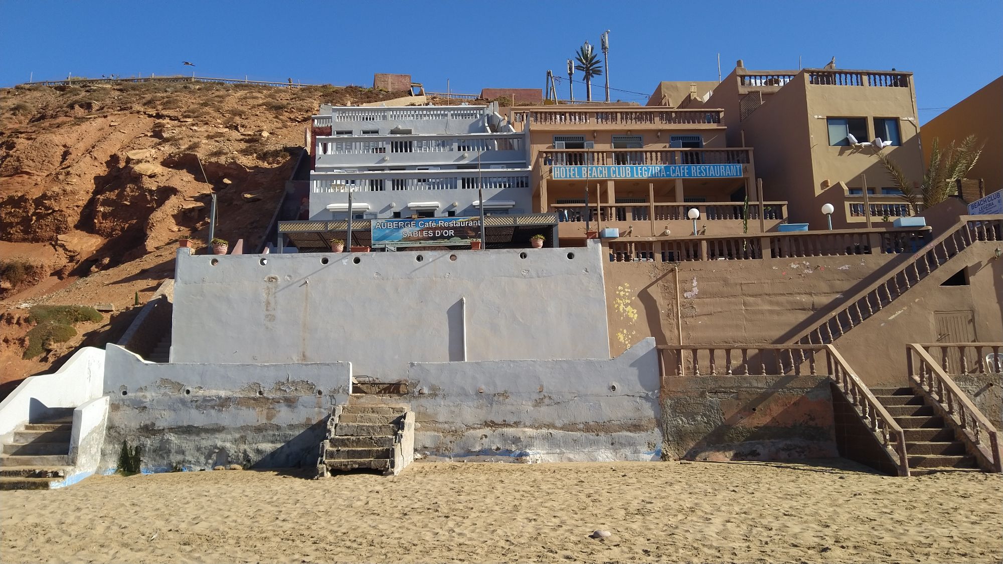 We realized there was a spot on the beach further south that we had missed. So he took another route back to the beach where the oceans had carved huge arches into the rocks. There weren’t many choices for hotels but we found a good one. We were on the fourth floor and the hotel was on a bluff overlooking the ocean. The views were just incredible. Surprisingly the road where my motorcycle was parked was on the fifth floor above us. We had a great chicken tajine on the beach. He stayed open just to feed us. No rush.