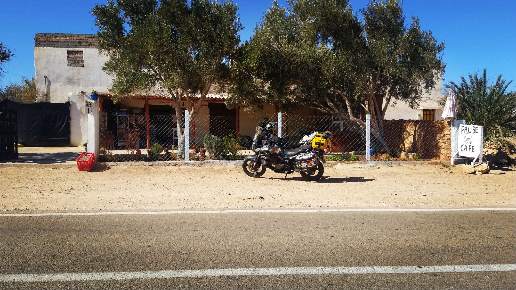 Leaving Essaouira we continued down the coast towards Agadir. Along the way we stopped at the Pause Cafe. We had been on a long dusty route not only came across this place in the middle of nowhere. We grabbed a couple of the large waters (1.5 liter) and headed into the next town.