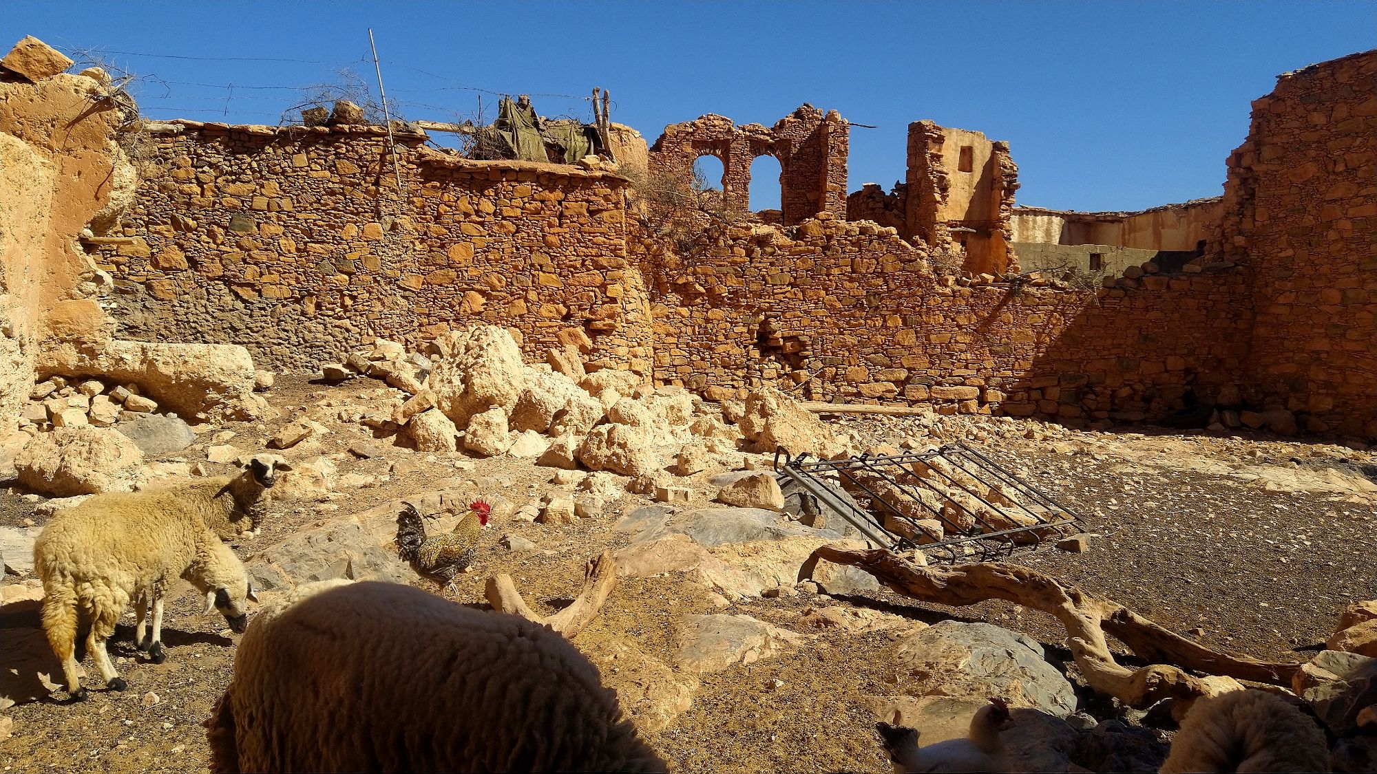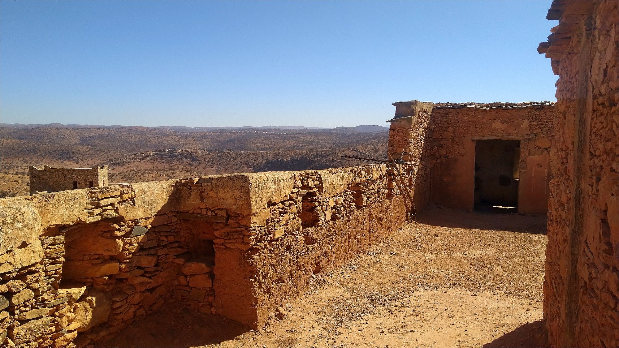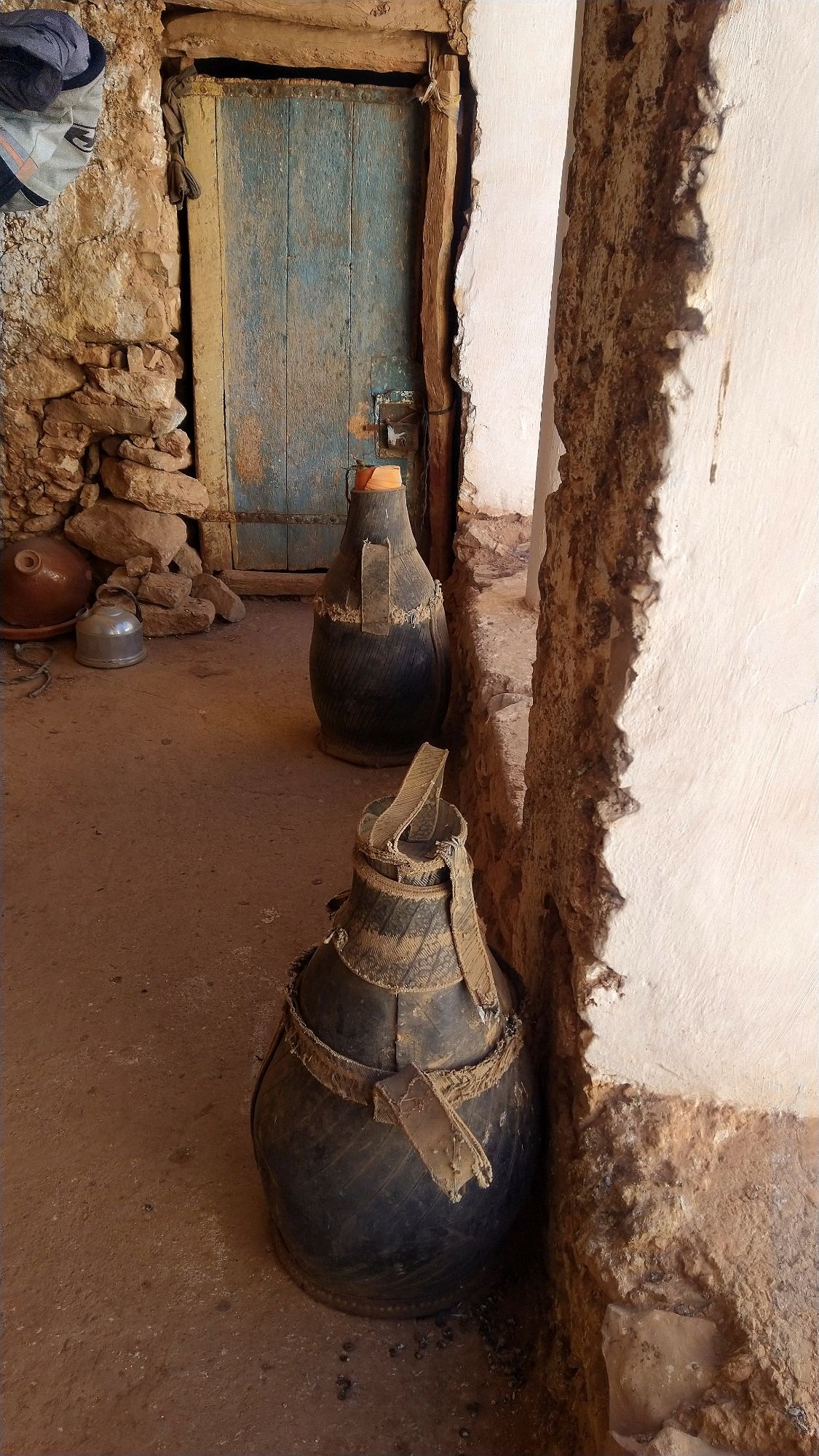 A friend of ours, Henriette Thiim (“fortheloveofwheels”), had recommended for us to visit the Kassba Afayene Inoumare. Our first try using the GPS took us on a route that eventually went to sand and ended. We saw our destination ahead. Yet, it lay beyond a dry rocky expanse. We needed to cross a riverbed and climb a steep hill. Nope. We again tried and found a different route and the effort was totally worth it. We were met by a young girl as we arrived. Melanie got off the bike and went to talk with her. She showed her a picture of her that Henriette had sent Melanie. A big smile erupted on her face as she recognized the time the picture was taken. She even showed us where Henriette had camped for the night. She offered to show us through the amazing structure that was over 200 years old. Her family had lived there for several generations. Her GGGG grandfather, or there about, had built this entire structure by hand.