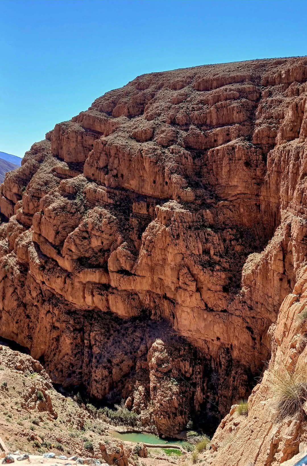 Today’s ride would have us heading west. We would trail the edge of the snow covered Atlas mountains. Our journey would lead to another famous gorge in Morocco, the Dades Gorge. The ride to the hotel would be 145 kilometers to the hotel. The hotel, Auberge La Fibule Du Dades, sits between two steep red mountain walls. The Oued (river) Dades is just on the other side of the road. We were met at the door by the owner and host, Hussain. He invited us to the roof for tea. The views are stunning. The red rocks soar hundreds of feet. They are cut off by a blue sky so brilliant it would make a Crayola crayon wince. We would be the only guest tonight and he gives us the best room in the house. We dropped off our luggage and headed north towards the gorge.