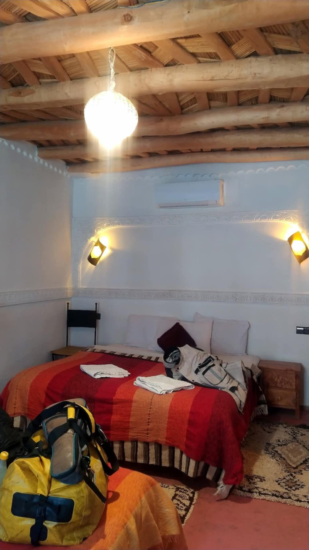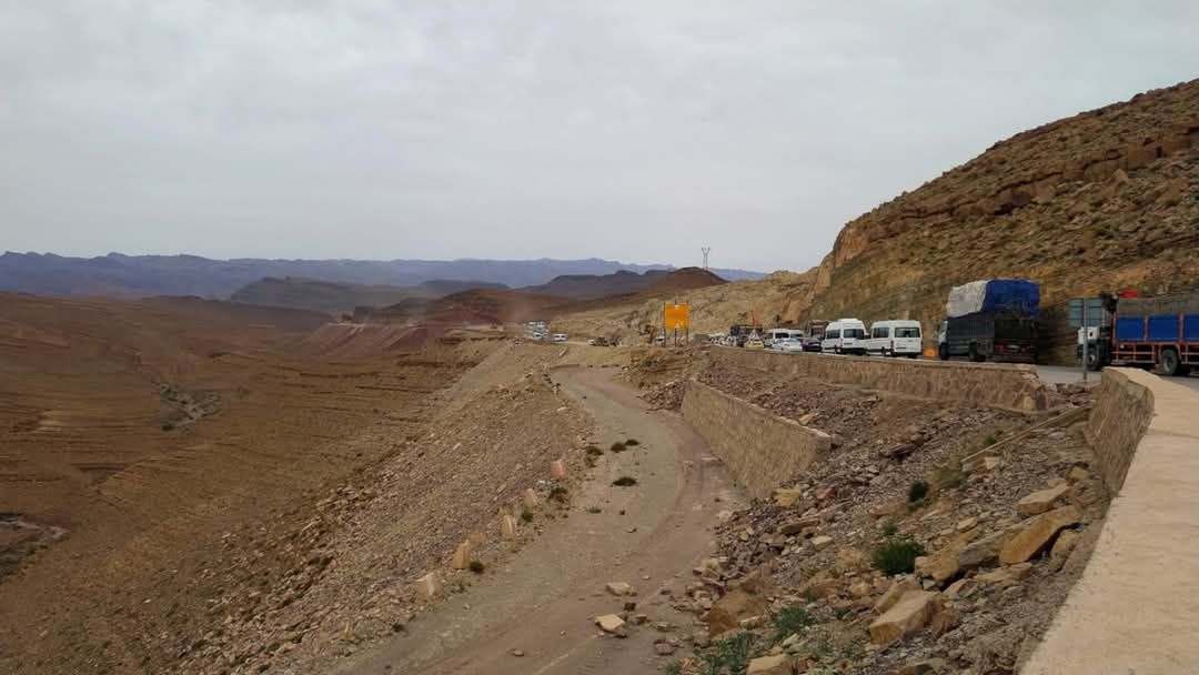 Leaving Ouarzazate we headed south instead of east. We were headed towards the great sand dunes of the northern Sahara desert. The road was good and we were making good time. A short distance ahead of us I saw a giant dust plume rising. At first I thought it was a mining operation. As we came around the corner we realized it was more. The road was gone. A giant landslide had taken out a part of the road. Heavy equipment was in place as they were starting to clear the landslide. The dust plume we saw had been an explosion making the giant bowlers blocking the road, smaller. Getting off the bike I walked down to investigate. It would be a while but a path through would be cleared at some point. We were first in line and after a couple hours there were maybe a hundred people waiting. Quite the party. When it was time to go through, we let the buses and trucks go first. We followed after the dust had settled. As the shadows were getting long we decided to stop. We found a kasbah in the next town and stopped for the night.