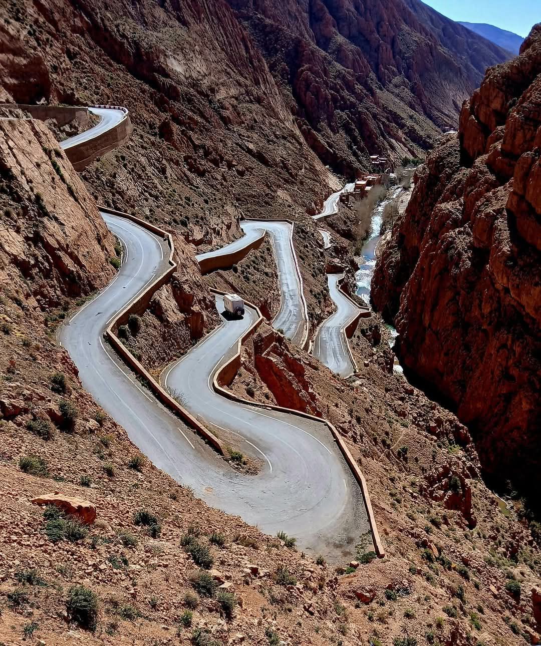 Today’s ride would have us heading west. We would trail the edge of the snow covered Atlas mountains. Our journey would lead to another famous gorge in Morocco, the Dades Gorge. The ride to the hotel would be 145 kilometers to the hotel. The hotel, Auberge La Fibule Du Dades, sits between two steep red mountain walls. The Oued (river) Dades is just on the other side of the road. We were met at the door by the owner and host, Hussain. He invited us to the roof for tea. The views are stunning. The red rocks soar hundreds of feet. They are cut off by a blue sky so brilliant it would make a Crayola crayon wince. We would be the only guest tonight and he gives us the best room in the house. We dropped off our luggage and headed north towards the gorge.