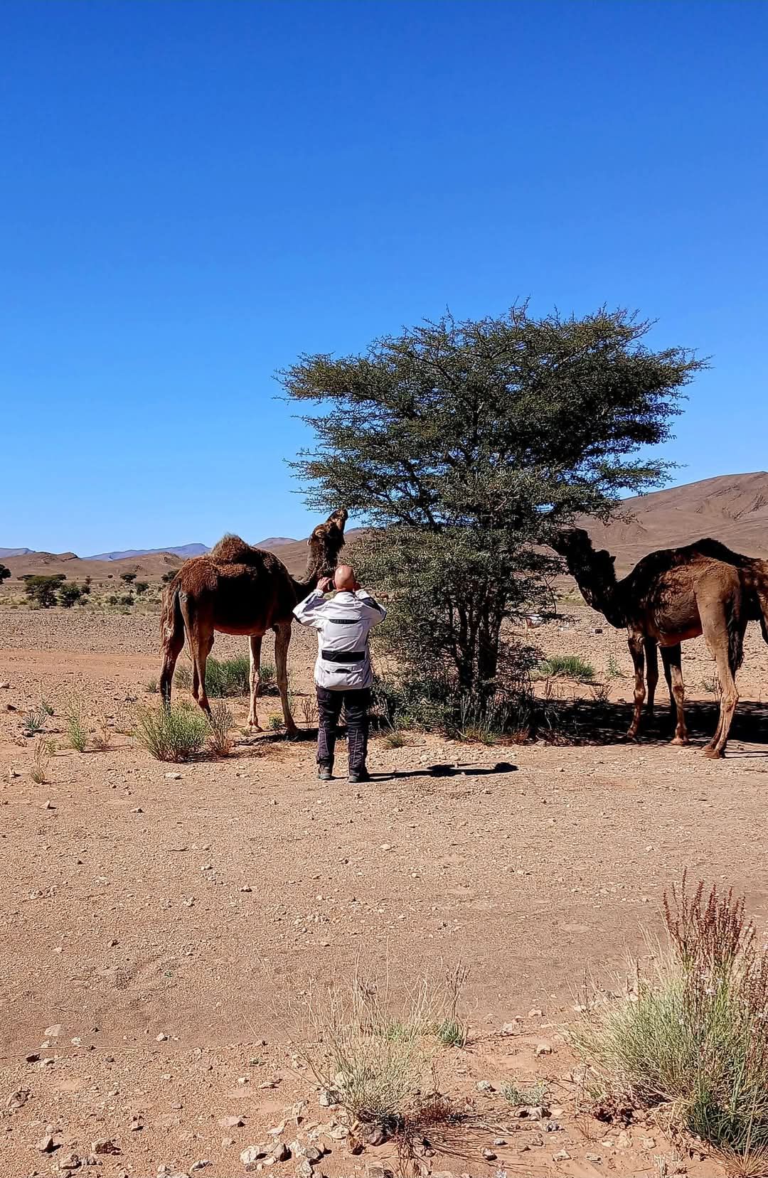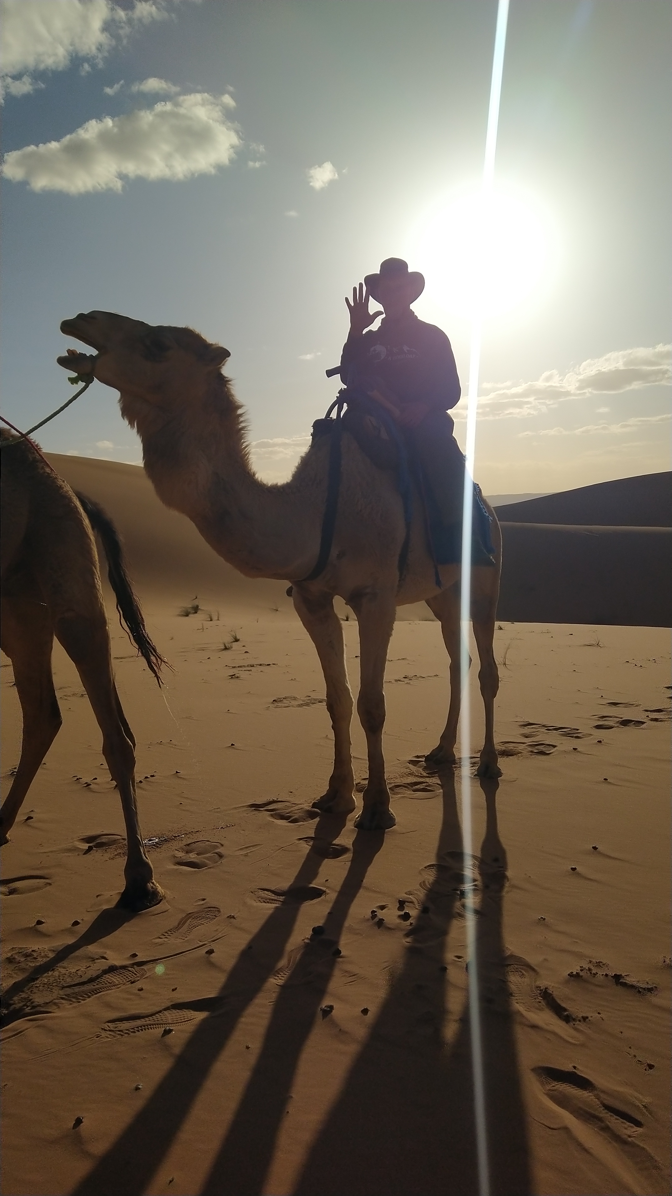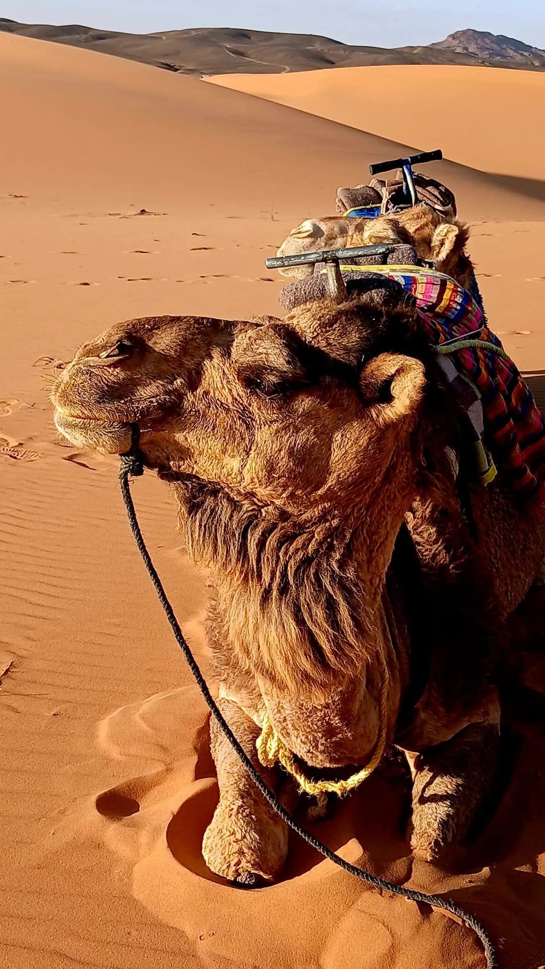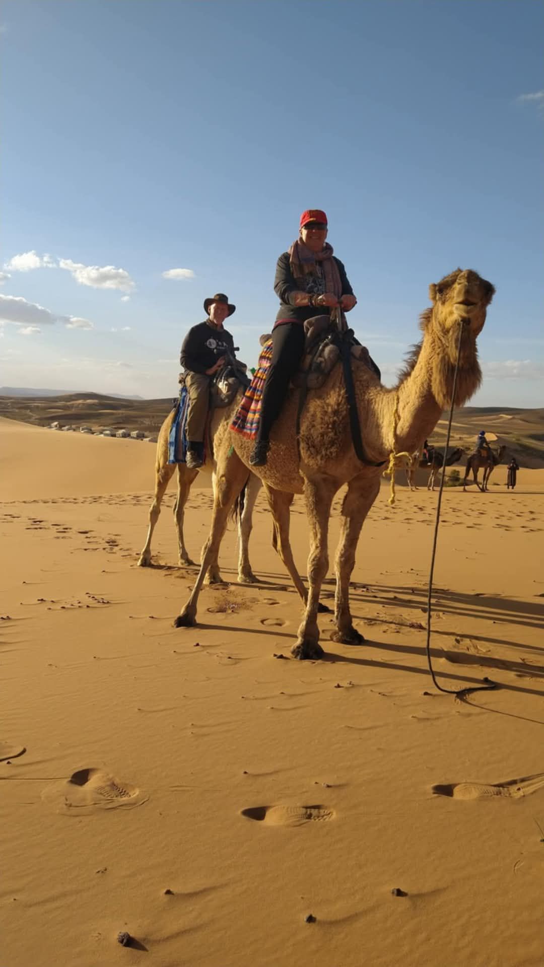 We continued on to where we would be camping for the night. It wasn’t my traditional camping. It’s more what you would call glamping. Very posh. Plus we had a surprise waiting for us. Joining us would be 20 young women from New York with one man. We certainly wondered about the dynamics of this noisy and brassy group. It seems one of them runs a non-profit and is a social media vlogger. She even told us how popular she is. The reason for the non-profit is to promote inexpensive solo travel for women. I think I was successful in hiding my smile and stifling my laugh. They were so far from the reason for doing this. Have you ever seen 20 sparkly glammed up women taking selfies with a camel? Think about that one. Anyway, off we went on the camels into the dunes to catch our sunset camel photos that are so coveted. I saw the clouds on the horizon and realized a great sunset wouldn’t be happening on this night. We got on our camels and headed back to camp. At a stop we were talking with a French couple. Their camels got into a vicious fight. They were so frightened after the fight they decided to walk back to their camp. By the time we got back, Melanie had made it clear. Two camel rides, in Egypt and here, were enough for her. She didn’t want any more for the rest of her life. A delicious chicken tagine meal was waiting for us when we returned. After dinner was music and a blazing fire warming up the cool desert air. After a great night sleep we headed back and out of Merzouga, heading north.
