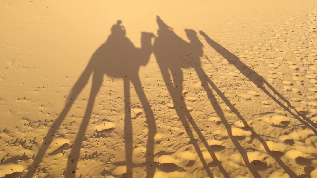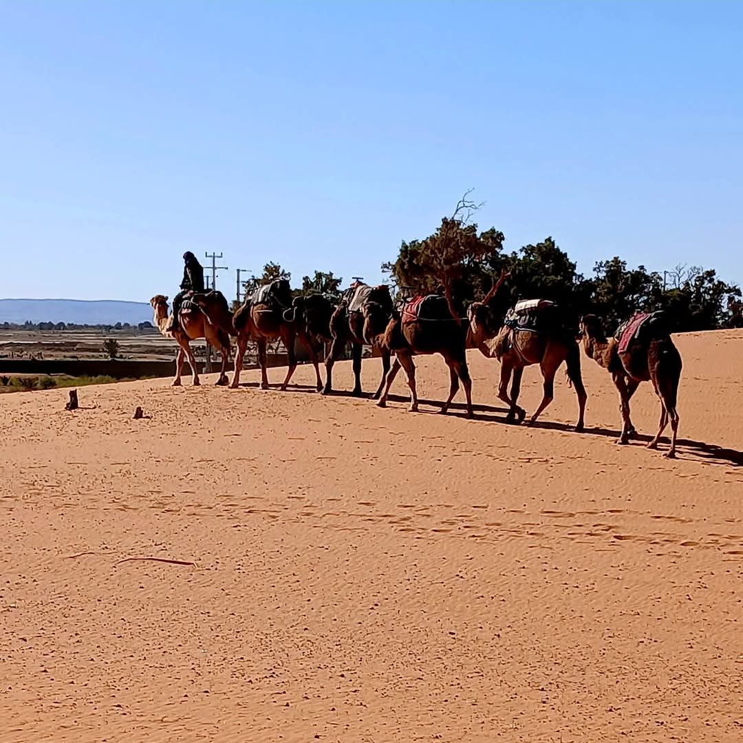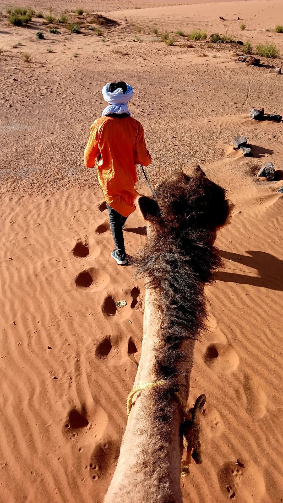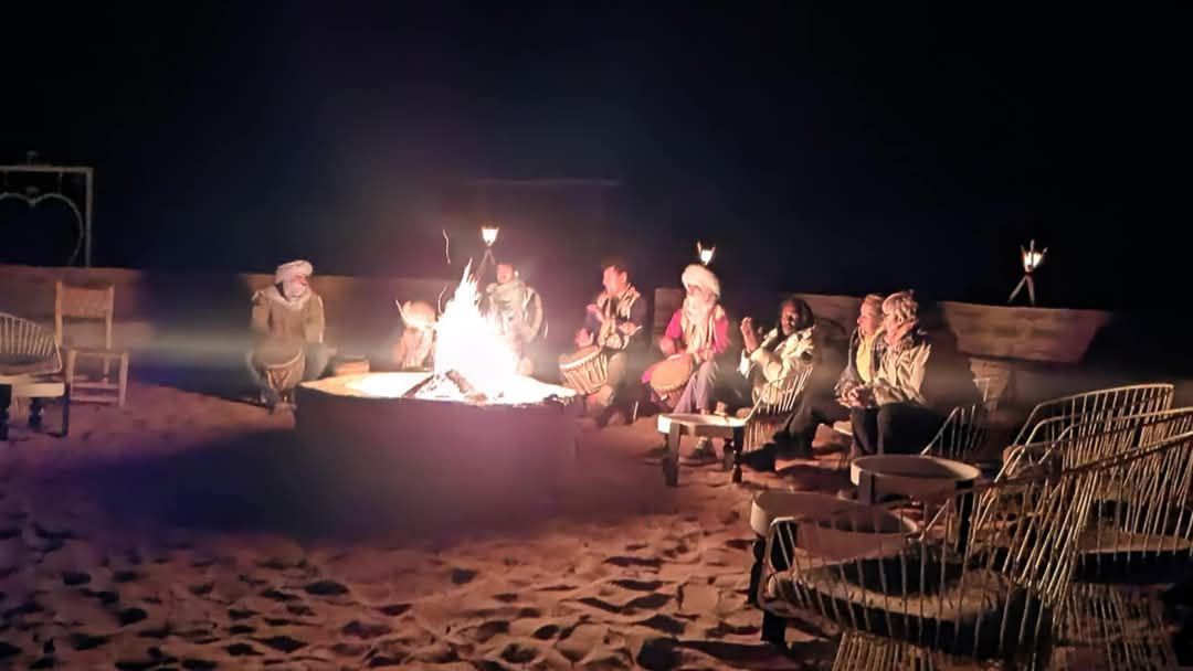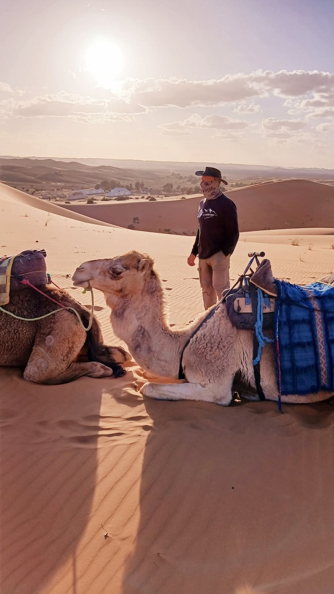 We continued on to where we would be camping for the night. It wasn’t my traditional camping. It’s more what you would call glamping. Very posh. Plus we had a surprise waiting for us. Joining us would be 20 young women from New York with one man. We certainly wondered about the dynamics of this noisy and brassy group. It seems one of them runs a non-profit and is a social media vlogger. She even told us how popular she is. The reason for the non-profit is to promote inexpensive solo travel for women. I think I was successful in hiding my smile and stifling my laugh. They were so far from the reason for doing this. Have you ever seen 20 sparkly glammed up women taking selfies with a camel? Think about that one. Anyway, off we went on the camels into the dunes to catch our sunset camel photos that are so coveted. I saw the clouds on the horizon and realized a great sunset wouldn’t be happening on this night. We got on our camels and headed back to camp. At a stop we were talking with a French couple. Their camels got into a vicious fight. They were so frightened after the fight they decided to walk back to their camp. By the time we got back, Melanie had made it clear. Two camel rides, in Egypt and here, were enough for her. She didn’t want any more for the rest of her life. A delicious chicken tagine meal was waiting for us when we returned. After dinner was music and a blazing fire warming up the cool desert air. After a great night sleep we headed back and out of Merzouga, heading north.