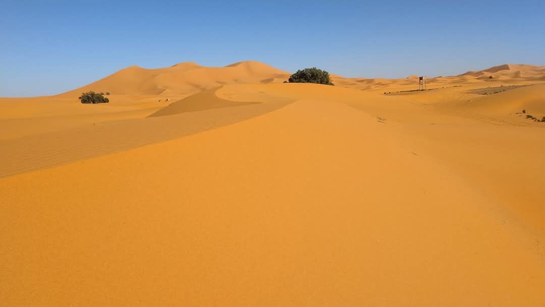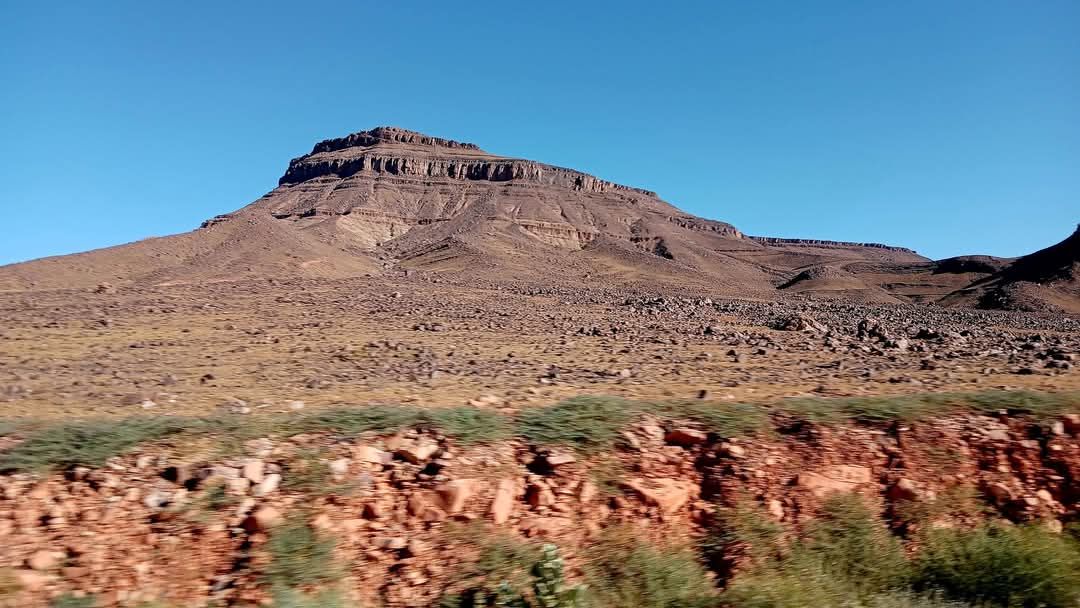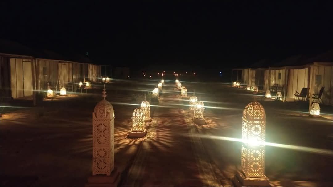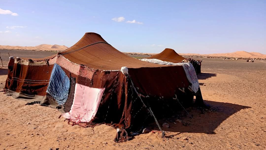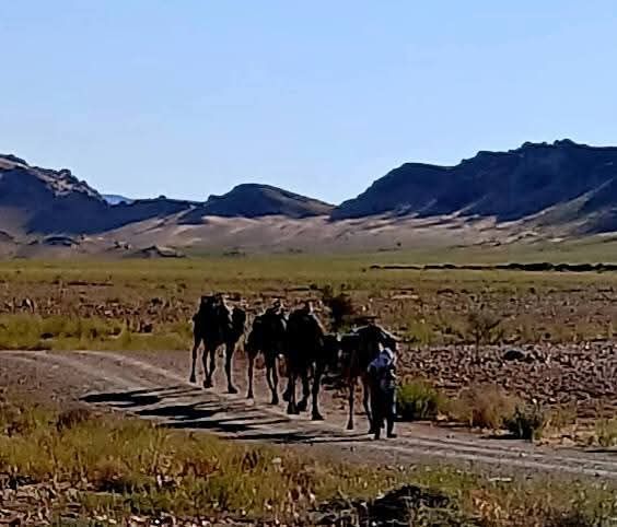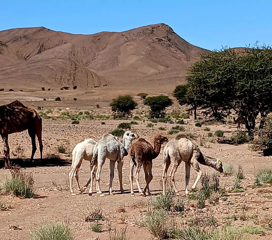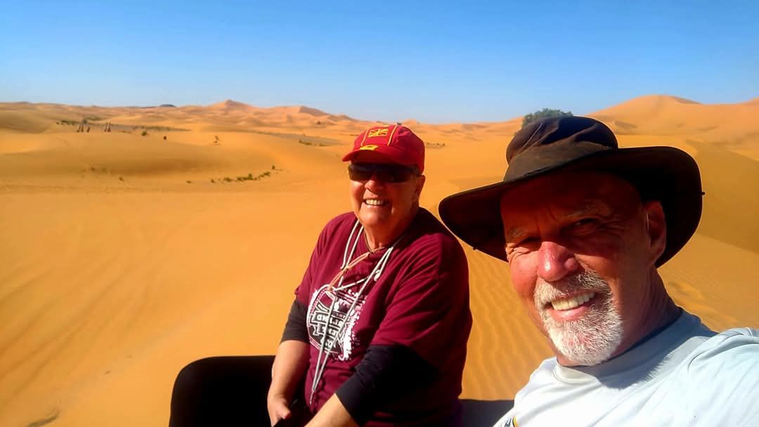 We continued on to where we would be camping for the night. It wasn’t my traditional camping. It’s more what you would call glamping. Very posh. Plus we had a surprise waiting for us. Joining us would be 20 young women from New York with one man. We certainly wondered about the dynamics of this noisy and brassy group. It seems one of them runs a non-profit and is a social media vlogger. She even told us how popular she is. The reason for the non-profit is to promote inexpensive solo travel for women. I think I was successful in hiding my smile and stifling my laugh. They were so far from the reason for doing this. Have you ever seen 20 sparkly glammed up women taking selfies with a camel? Think about that one. Anyway, off we went on the camels into the dunes to catch our sunset camel photos that are so coveted. I saw the clouds on the horizon and realized a great sunset wouldn’t be happening on this night. We got on our camels and headed back to camp. At a stop we were talking with a French couple. Their camels got into a vicious fight. They were so frightened after the fight they decided to walk back to their camp. By the time we got back, Melanie had made it clear. Two camel rides, in Egypt and here, were enough for her. She didn’t want any more for the rest of her life. A delicious chicken tagine meal was waiting for us when we returned. After dinner was music and a blazing fire warming up the cool desert air. After a great night sleep we headed back and out of Merzouga, heading north.