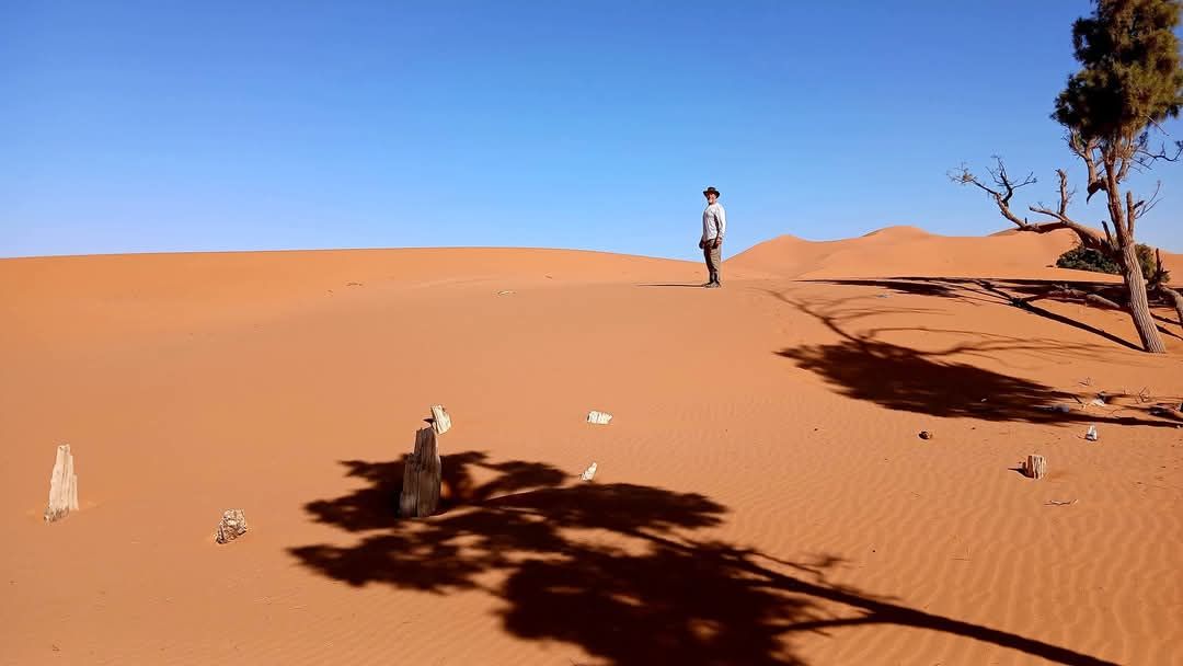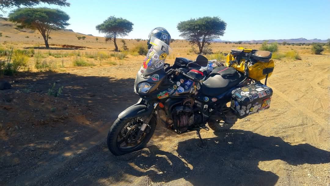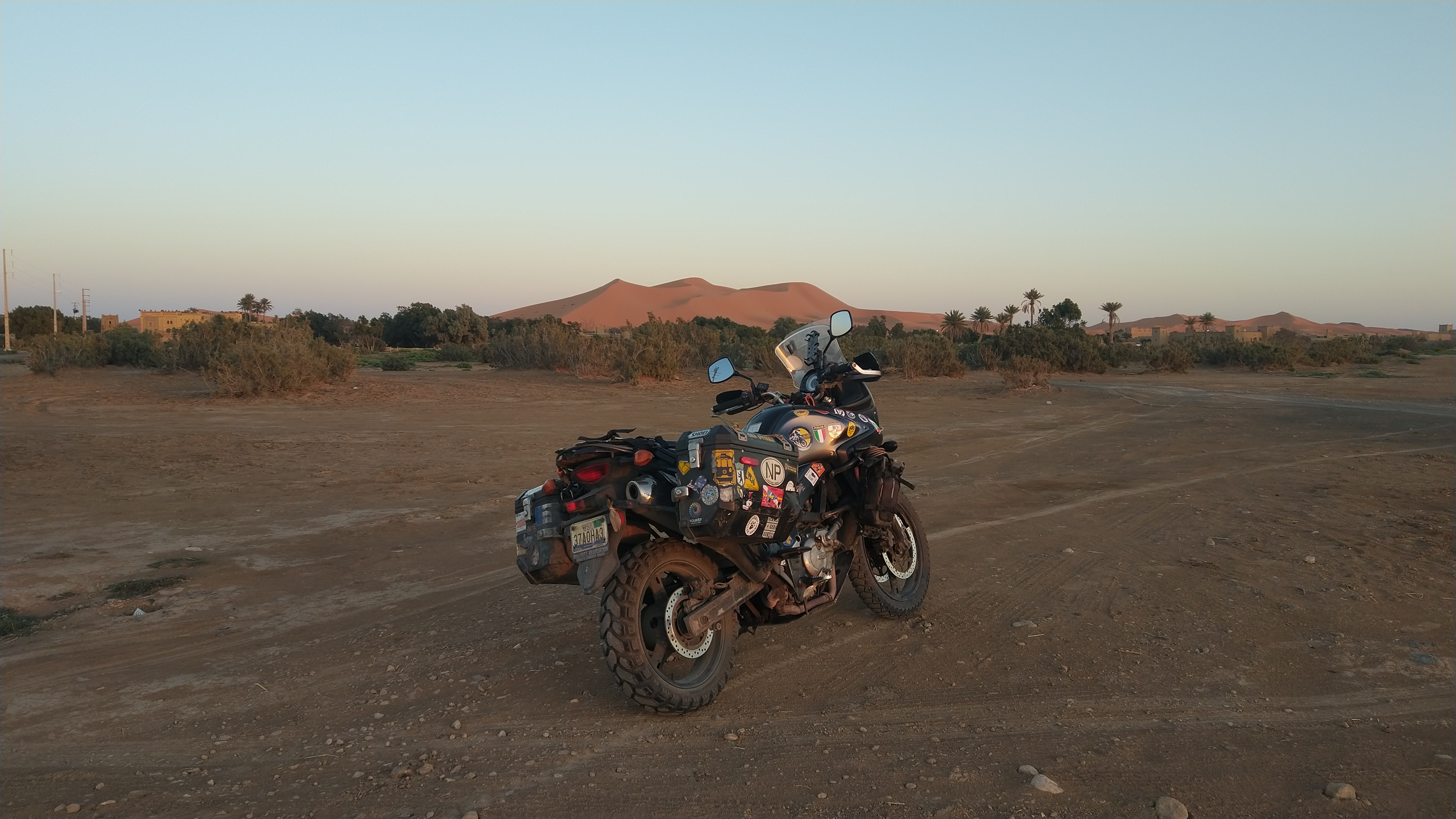 We left Zagora early in the cool of the morning heading east towards Merzouga. In the south of Morocco the desert temperatures in the morning were chilly. We would pack in the morning with temperatures around 5° C (40° F). Merzouga is a small Moroccan town in the Sahara desert, near the Algerian border. It is known as a gateway to Erg Chebbi, a huge expense of sand dunes north of town. The distance between the two was about 279 kms. The sand dunes were visible from a distance of 50 kms. The road was deserted for pretty much the entire length. That is except for the occasional donkey or dromedary (camel). As we were riding along one deserted particular stretch we were looking for goats in trees. The argon trees are a tasty staple of diet for animals in this region. We had seen a bunch of goats in the trees a few days earlier. That’s when we saw a real treat. A huge herd of camels with their babies munching on the argon trees. We quickly pulled over and stopped in the soft sand to get some photos. The amazing thing is they’re so calm. I got up close to take some photos. Then I scratched one on the neck and he barely even looked at me. So cool.
