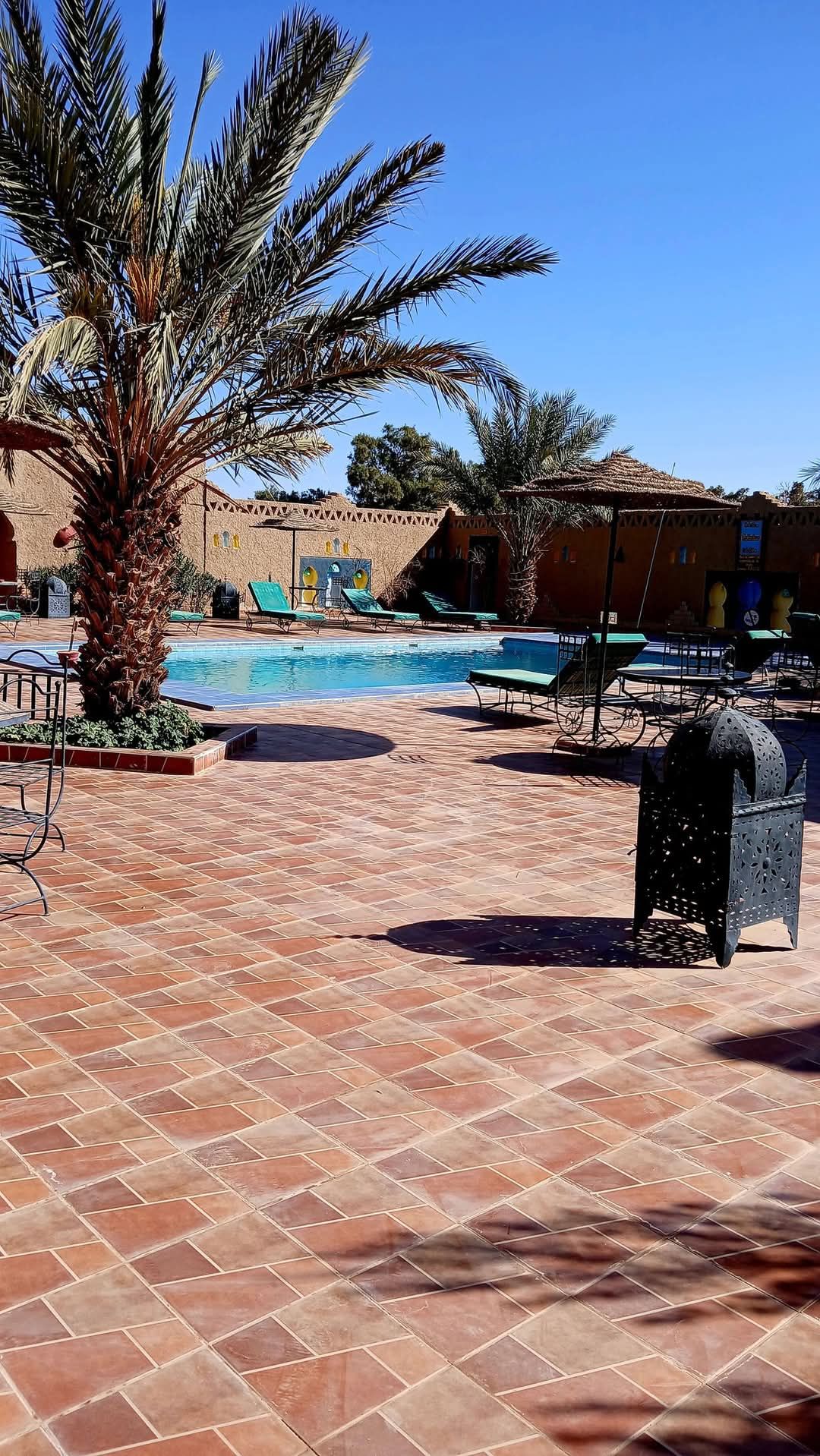 When we were satisfied with the time spent there we headed on towards the giant red sand dunes. We found a place on the south side of the small village. It backed up to the dunes, Les Portes Du Desert. This one, like most of the others, said it had a restaurant. The surprising part? It actually did and it was open. It was a very nice compound with an oasis feel, including a cool pool. We would spend one night here and another night at a Berber camp in the desert. They kindly allowed us to leave our motorcycle. They also stored our gear while we were gone for the next night.