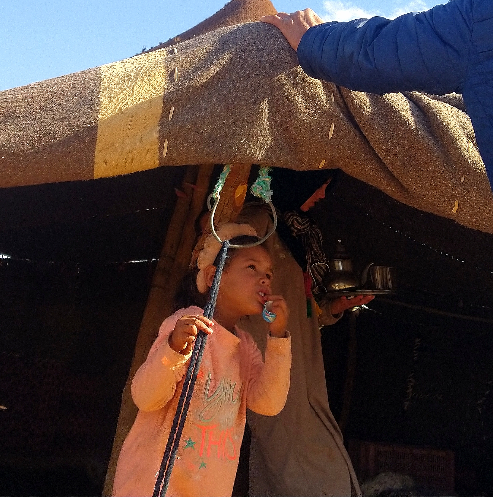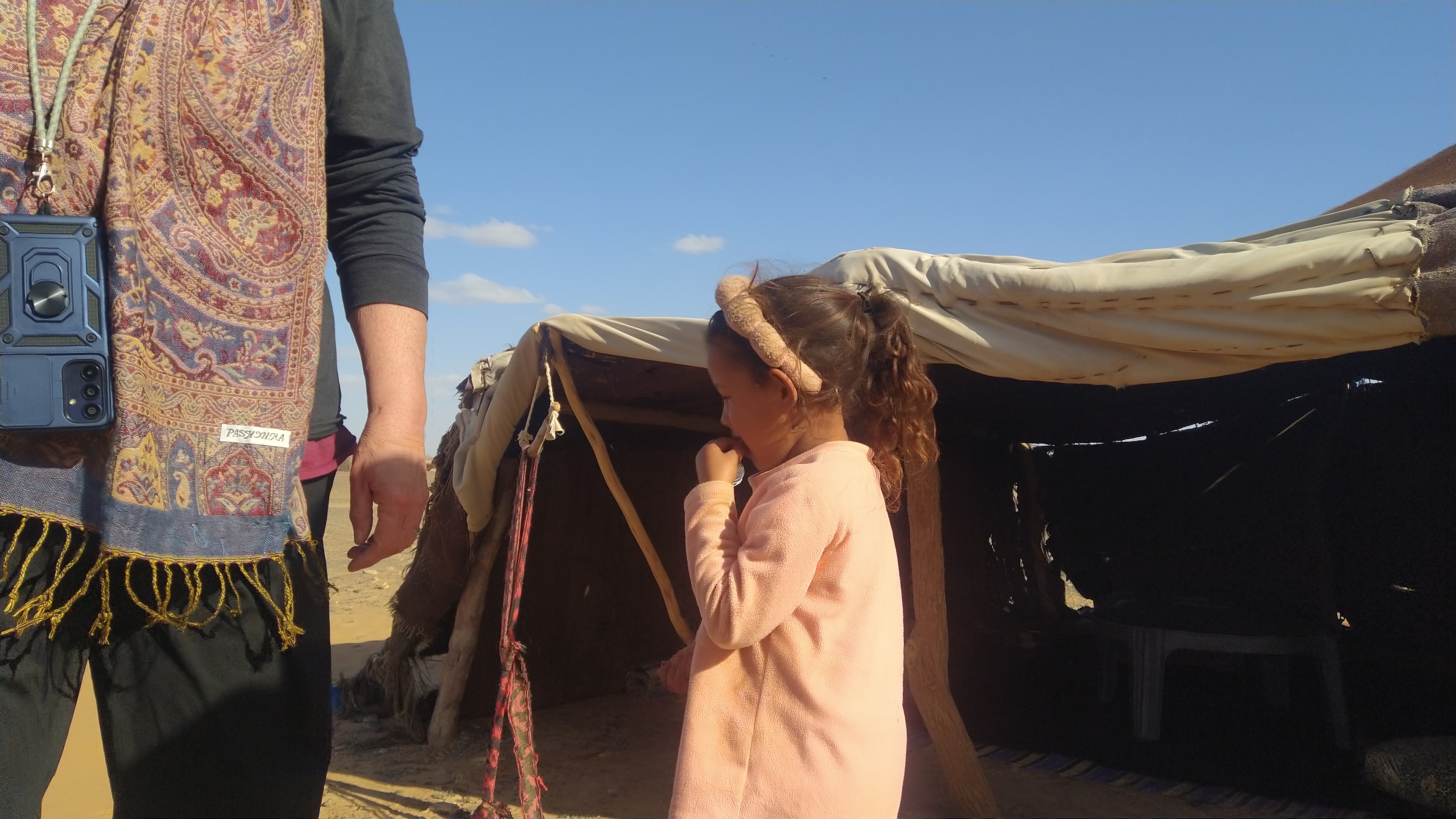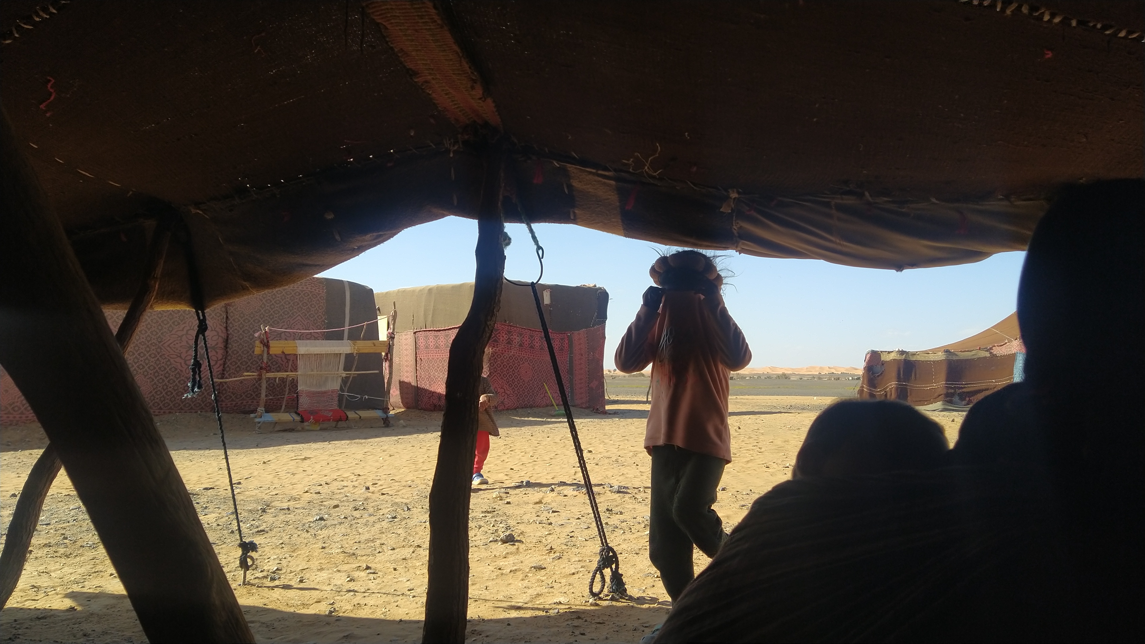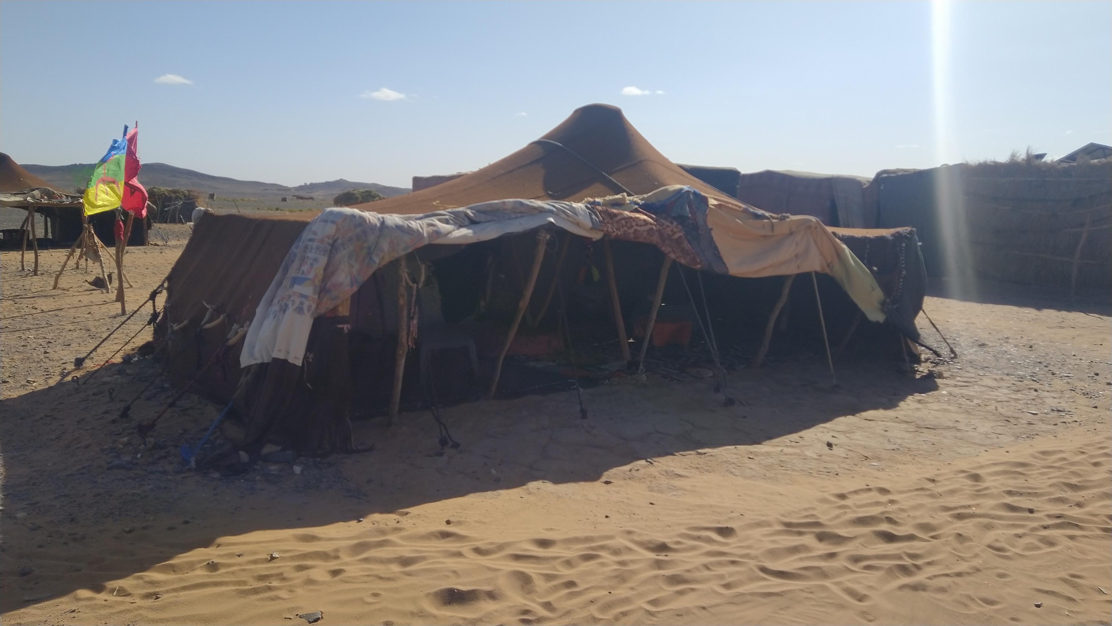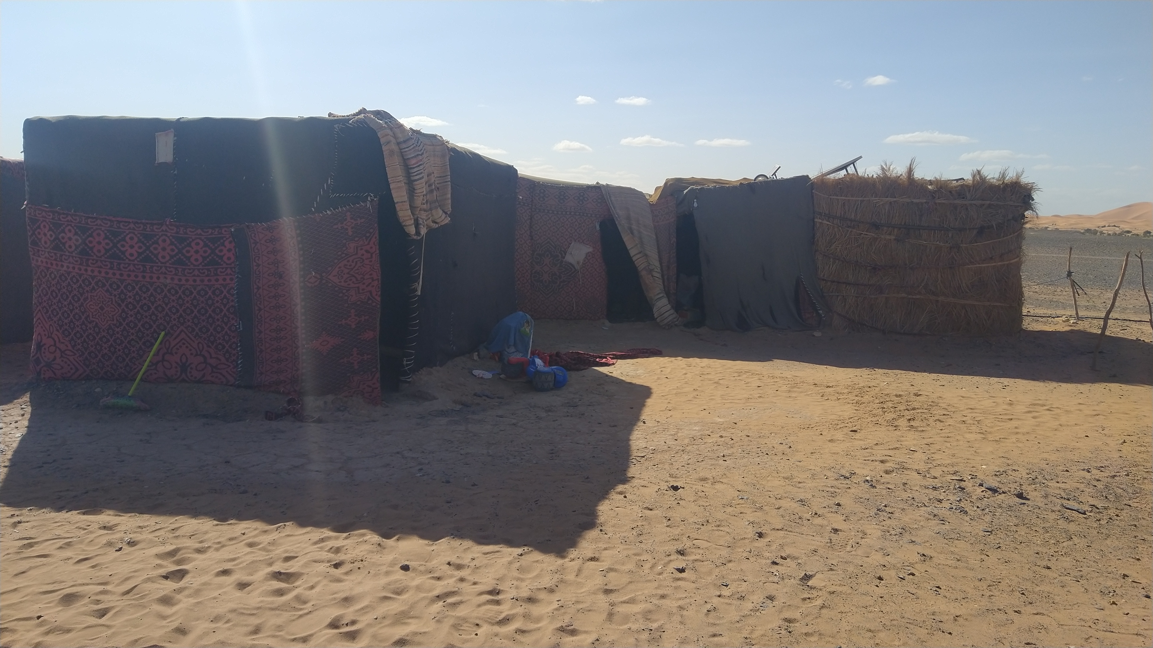 The next day we explored the town in the area. Merzouga, as a tourist town, was a disappointment. There are camels wandering around everywhere outside of town. The front legs are tied together so they can’t run. Usually you can see handlers nearby. We got back to the hotel in time for the 4×4 pickup. It would take us into the desert. We left through the back gate of the hotel directly into the desert. We followed a sandy track, one of many. In the desert the tracks seem to go in all directions. We went through an old French mining area. We stopped at a Berber camp to visit a local nomadic woman. She was 30 years old and invited us in for tea. Our guide translated. Her three children and herself stay at the camp during the day. Her husband was out with the goats finding water and food for them. He would return at night. They had been at this location for 2 years. The rains in the area had provided enough food for the goats so they didn’t have to move. The children didn’t go to school. The oldest girl was 5 years old. She spoke a little English and could count to 10 in three different languages. Her life would be exactly like her mother’s and the many generations before them. Living in the desert, moving from place to place, existing. Sometimes it’s difficult to understand others way of life. But she and her children all seemed very happy. Maybe it’s just the simplicity. Melanie gave them some much appreciated candy, if smiles and hugs are an indicator.