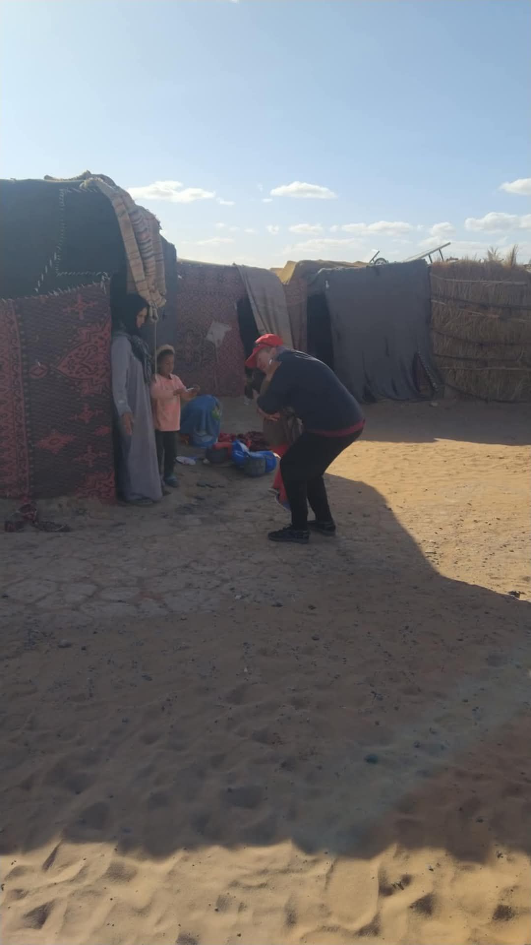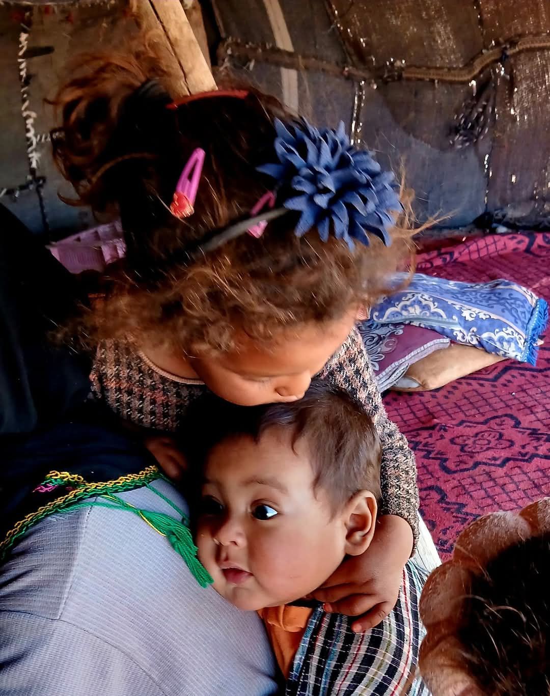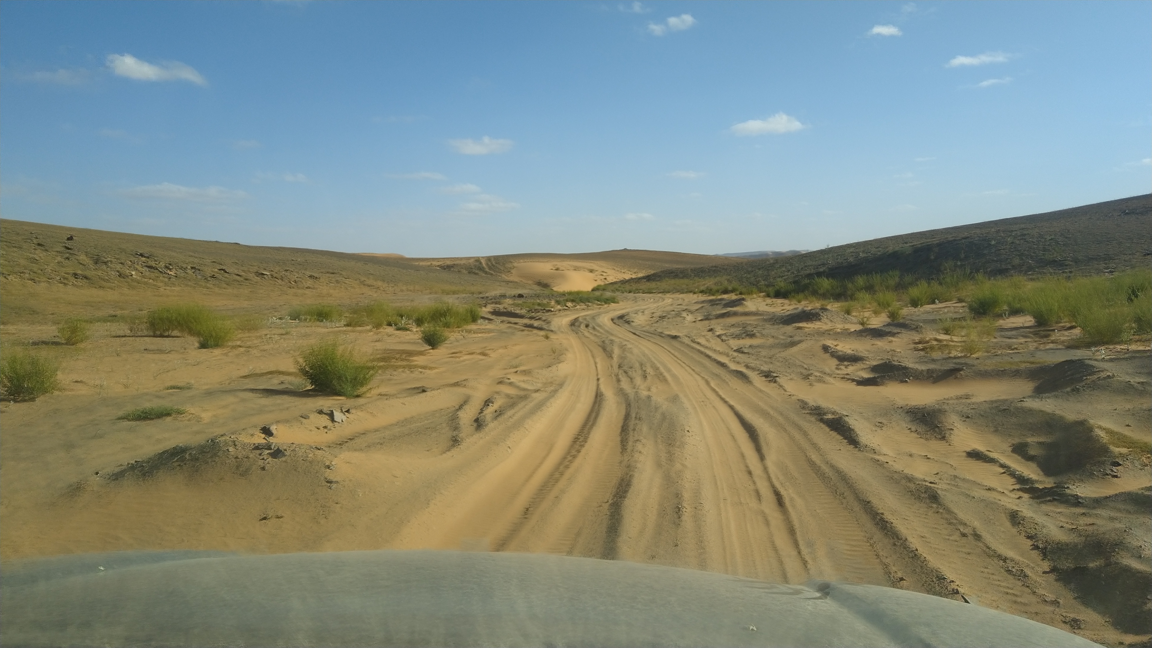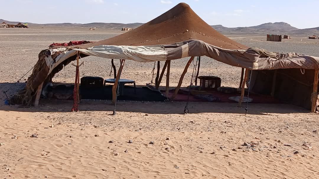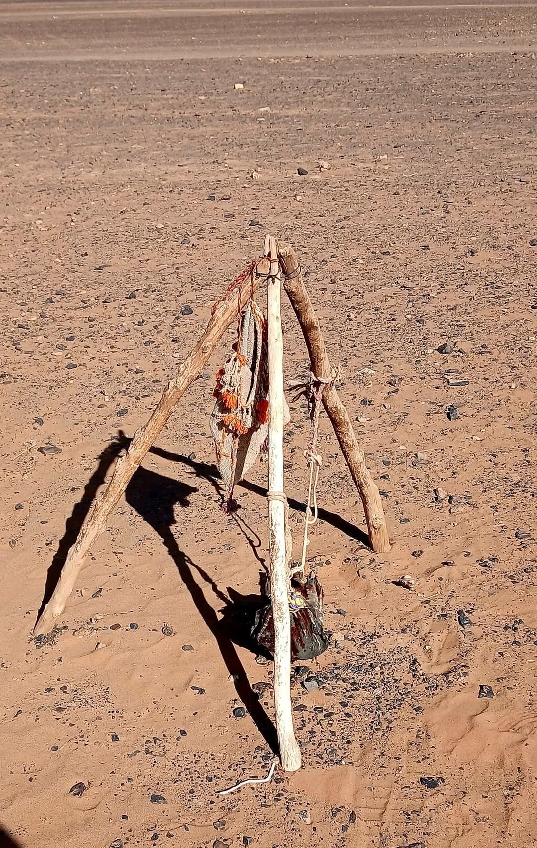 The next day we explored the town in the area. Merzouga, as a tourist town, was a disappointment. There are camels wandering around everywhere outside of town. The front legs are tied together so they can’t run. Usually you can see handlers nearby. We got back to the hotel in time for the 4×4 pickup. It would take us into the desert. We left through the back gate of the hotel directly into the desert. We followed a sandy track, one of many. In the desert the tracks seem to go in all directions. We went through an old French mining area. We stopped at a Berber camp to visit a local nomadic woman. She was 30 years old and invited us in for tea. Our guide translated. Her three children and herself stay at the camp during the day. Her husband was out with the goats finding water and food for them. He would return at night. They had been at this location for 2 years. The rains in the area had provided enough food for the goats so they didn’t have to move. The children didn’t go to school. The oldest girl was 5 years old. She spoke a little English and could count to 10 in three different languages. Her life would be exactly like her mother’s and the many generations before them. Living in the desert, moving from place to place, existing. Sometimes it’s difficult to understand others way of life. But she and her children all seemed very happy. Maybe it’s just the simplicity. Melanie gave them some much appreciated candy, if smiles and hugs are an indicator.