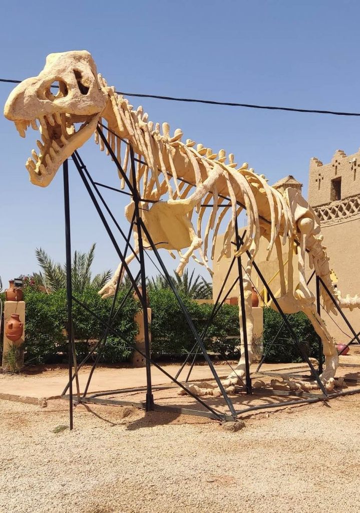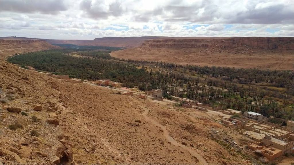 When we got back to the bike from the Berber camp we loaded up and headed north. The morning was cool and the sky against the reddish sand dune was a brilliant blue. We would parallel the sand dunes for 12 kms. The road would be paralleling the Oued (river) Ziz. This river cuts a path through the High Atlas mountains. Soon we came upon an oasis palm grove. The Ziz Oasis runs along this part of the river for 57 kms. It is the largest oasis in the world. This entire valley was once covered by a sea. It is renowned as the “largest open air fossil museum in the world”. Fossils have been found here from the middle Jurassic and Cretaceous periods. Along the road are places to turn off on dirt tracks to go search for fossils.