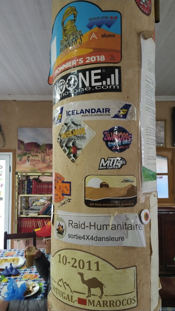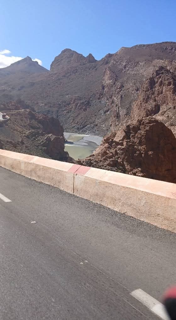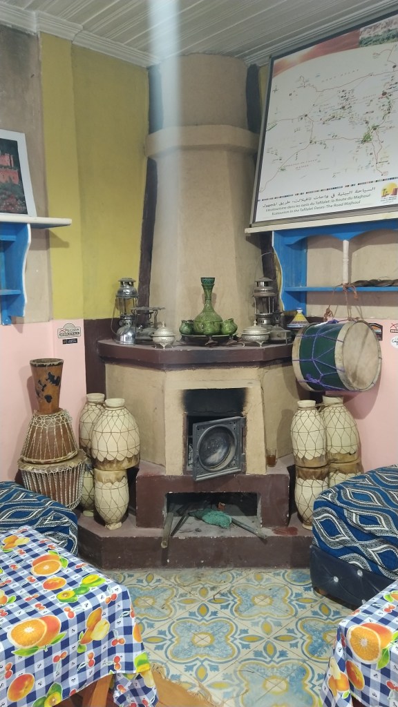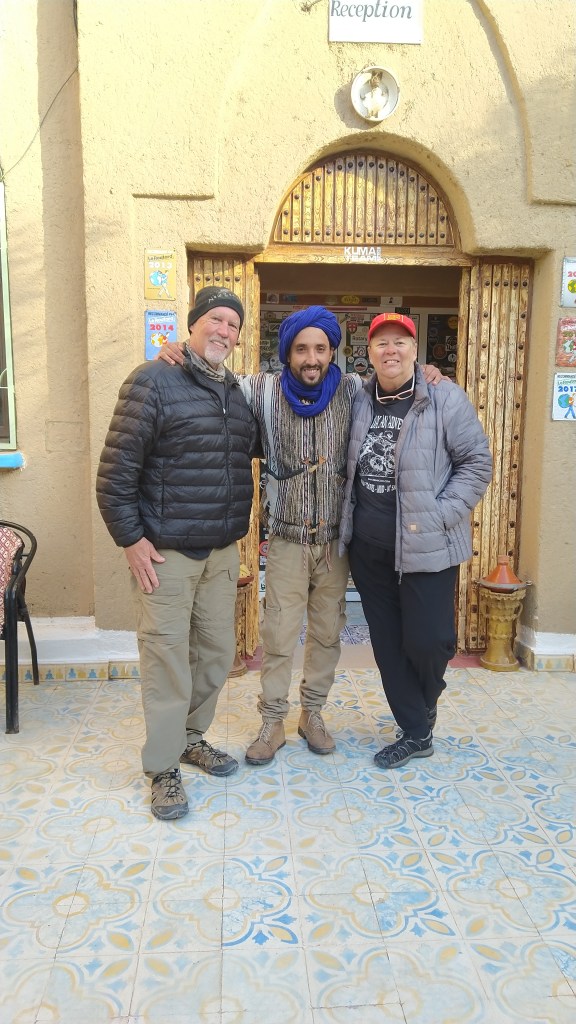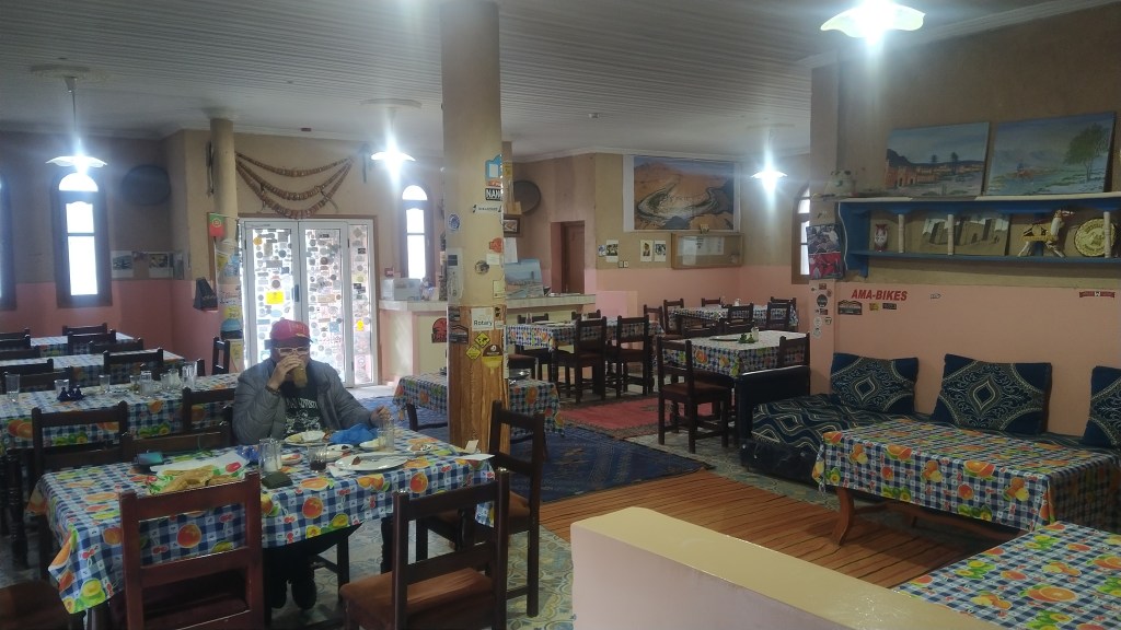 The road turned north once again in the town of Errachidia. The road would follow the Ziz River through the Ziz Gorges. The next 50 km are part of the Ziz Canyon National Park. Is defined on the south end by a large lake just north of town. I had found a camping hotel in the middle of the gorge right on the river, Kasbah Hotel Camping Jurassique. Our plan was just to spend one night. The host was a fascinating mix. His appearance combined the charisma of Rod Stewart and Geraldo Via Via from Guatemala. He gave us a room directly on the river. We shared the area with several people in the hotels and several campers. The place was so inexpensive and the views were so incredible we decided to stay two nights. They offered a free breakfast and an incredible chicken tagine, again.