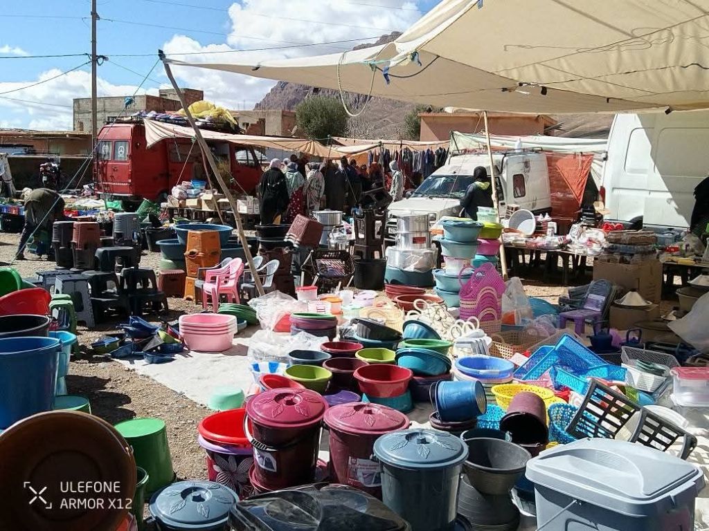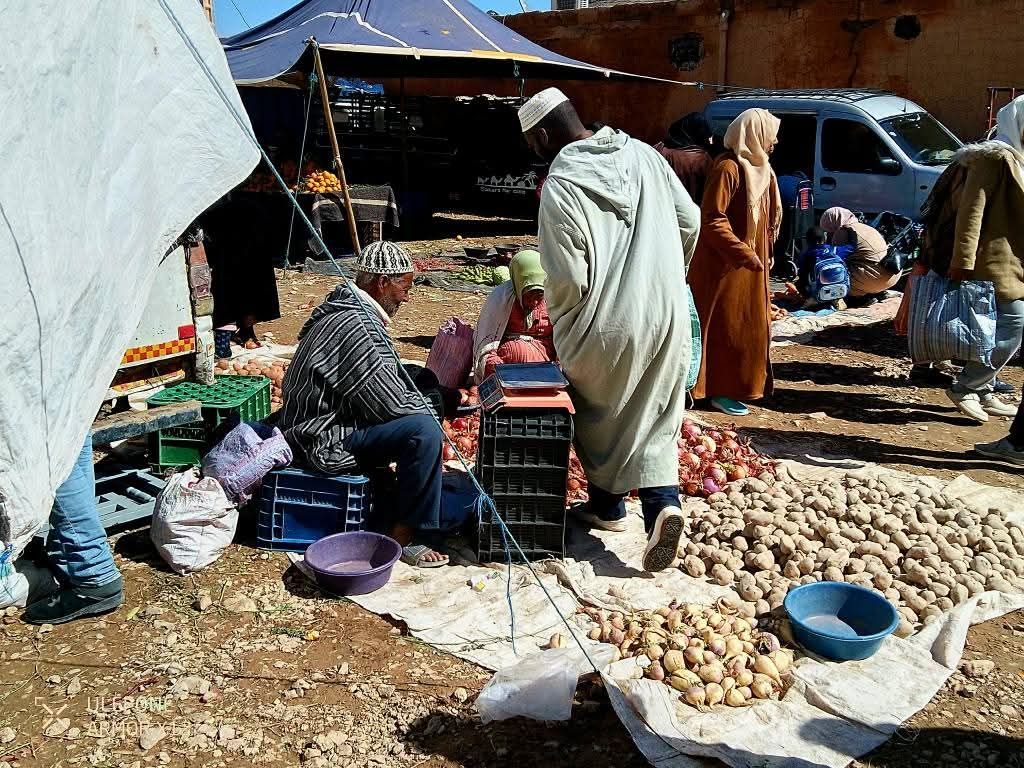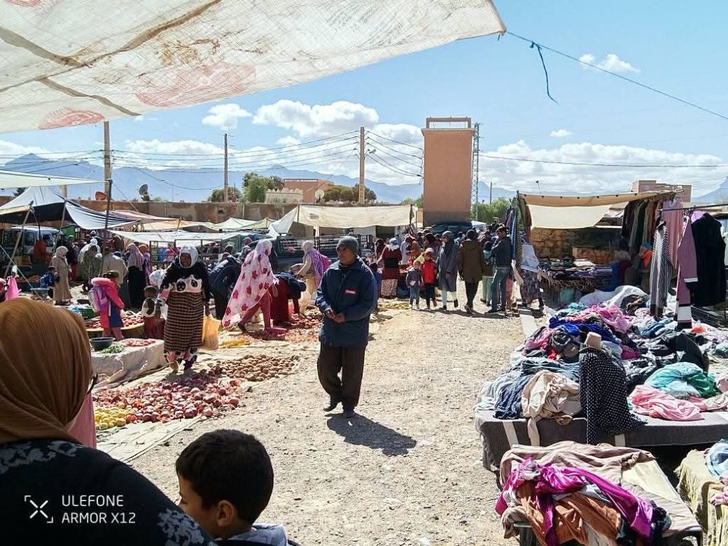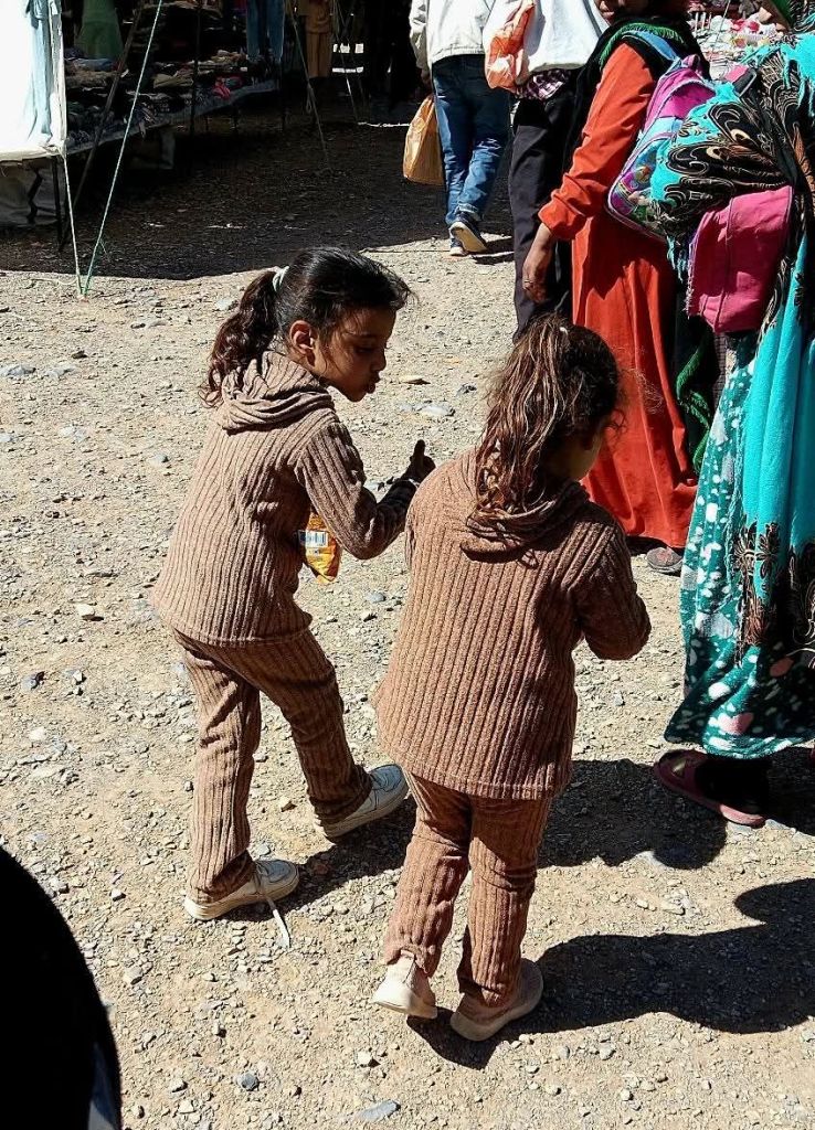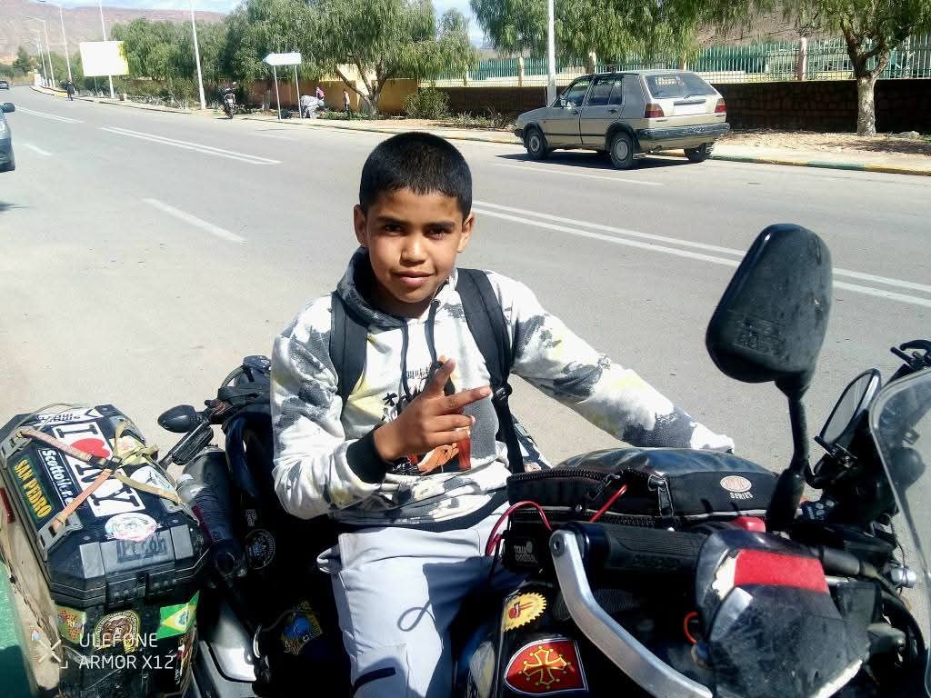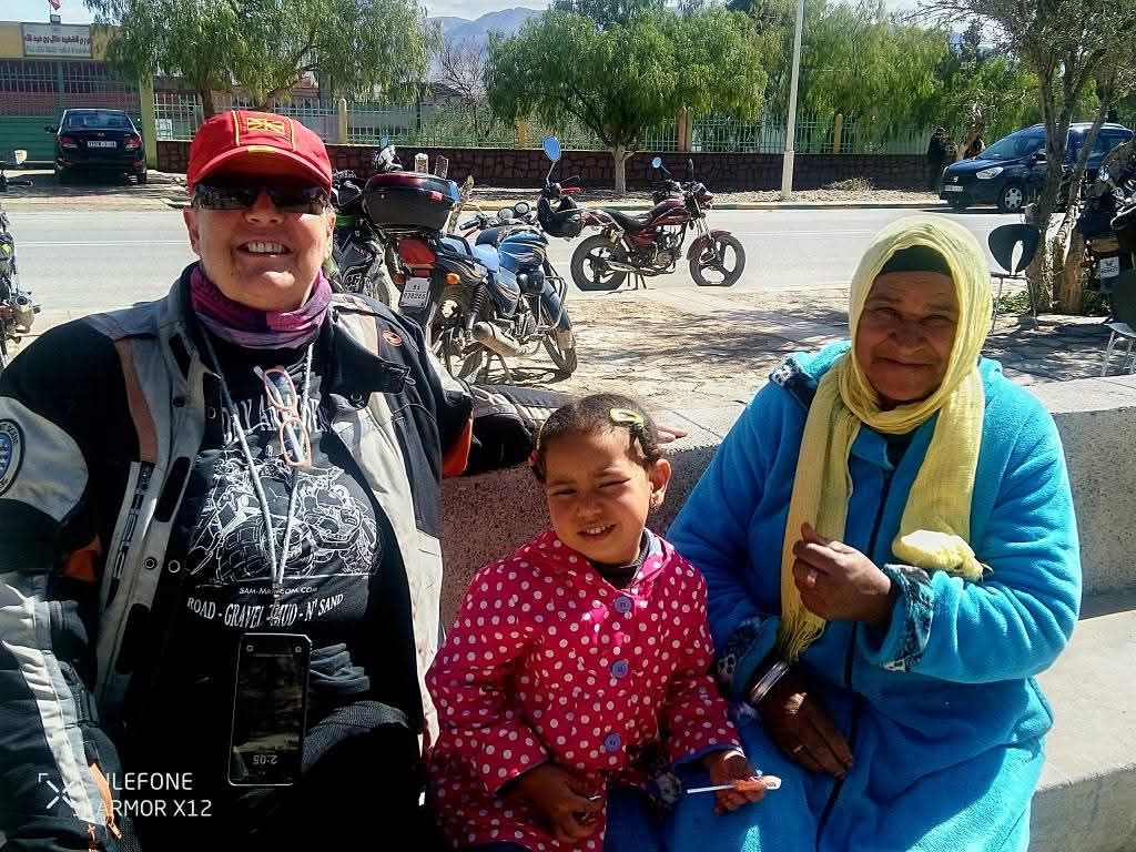On the way back a small town was having it’s Monday market. We parked right out front and walked in looking for some fruit, dates and nuts. The smells, colors and chaos just put you on overload. There was the sweet smell of fruits and dates, saffron and other spices. There was the multi-colors of tents and fabrics along with hanging animal parts. The children were all very curious. Melanie had a great time bargaining for strawberries and dates. She also delighted several children with pieces of candy. All this at their parents okay, of course. When we headed back to the bike several boys surrounded us. One wanted a selfie on the bike. I took his picture and he walked away. He probably doesn’t quite get the concept that the selfie should have been for him. There was a little girl sitting with her grandmother on a bench. Melanie approached them and asked a grandmother if it was okay to give the little girl a piece of candy. She nodded her head yes, and then asked for a piece of candy for herself. Just priceless.