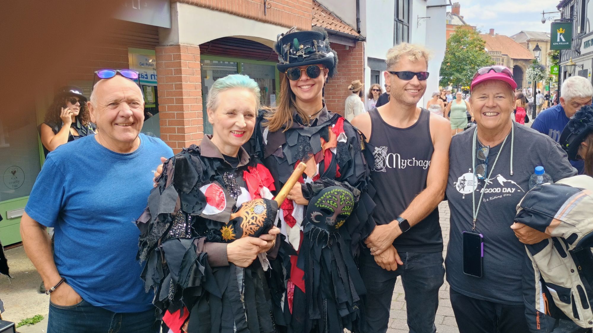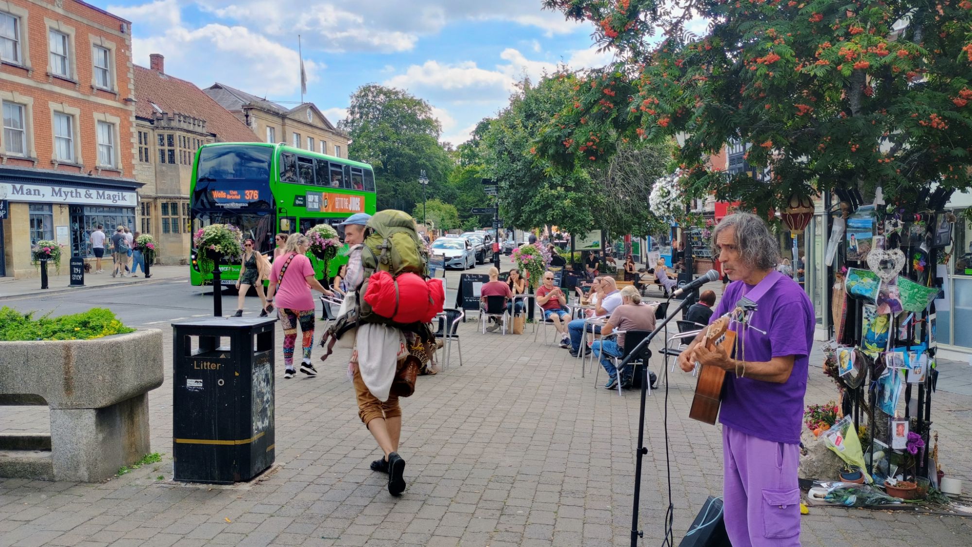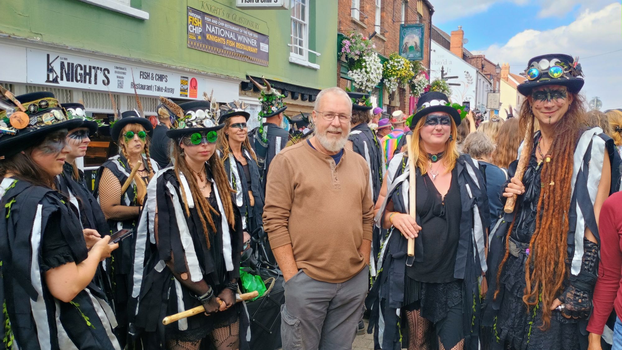 We arrived at our friend’s house and unloaded the bike. They had gone the a nearby village of Glastonbury for a festival. It was a Viking reenactment with other things going on. We asked them if there was a square or café centrally located. Can we just watch from here while seated? The answer was ‘Yes’. We needed to have some fun so off we went. After finding our way around a couple of closed roads we went into the village. The village was bustling. Parking was at a premium. Luckily, I was able to slide the motorcycle sideways between two cans on the main street. Only one hour parking? Let’s see how this works. It’s only a small footprint and nothing else could slide in. Fingers crossed.