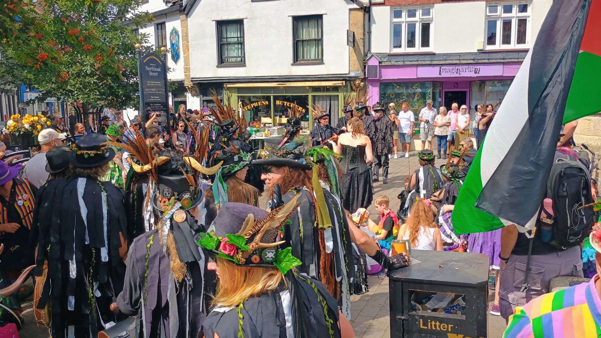 We found our friends and a great spot to sit and watch. And this was definitely worth watching. This was almost like a fringe festival. The Viking reenactments were happening inside the grounds of the Glastonbury Abbey. These are fabled remains of a wealthy monastery with links to King Arthur and Guinevere. The grounds are beautiful, but I was unable to walk much, so I sat with my Cappuccino. The streets seemed to all meet right here in the square. We were surrounded by old, well-kept stone buildings housing shops of all kinds. Across from us towered the Glastonbury Abbey. All around there were people in colorful costumes. Most of the themes seemed to be in black and white. And mostly with thin strips of cloth hanging from the costumes. They would dance to music while beating sticks together with music and chanting. The wooden sticks were beating together with another person. The feel was of a Pagan festival. It was a great festive attitude with all the watchers clapping and moving to the music.