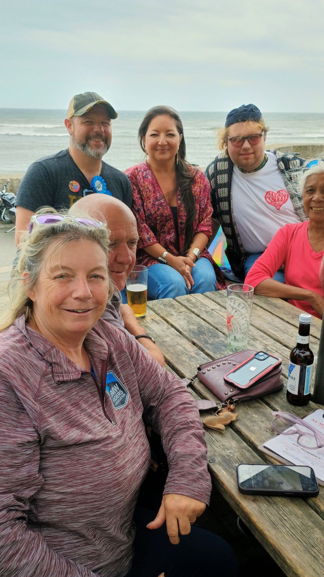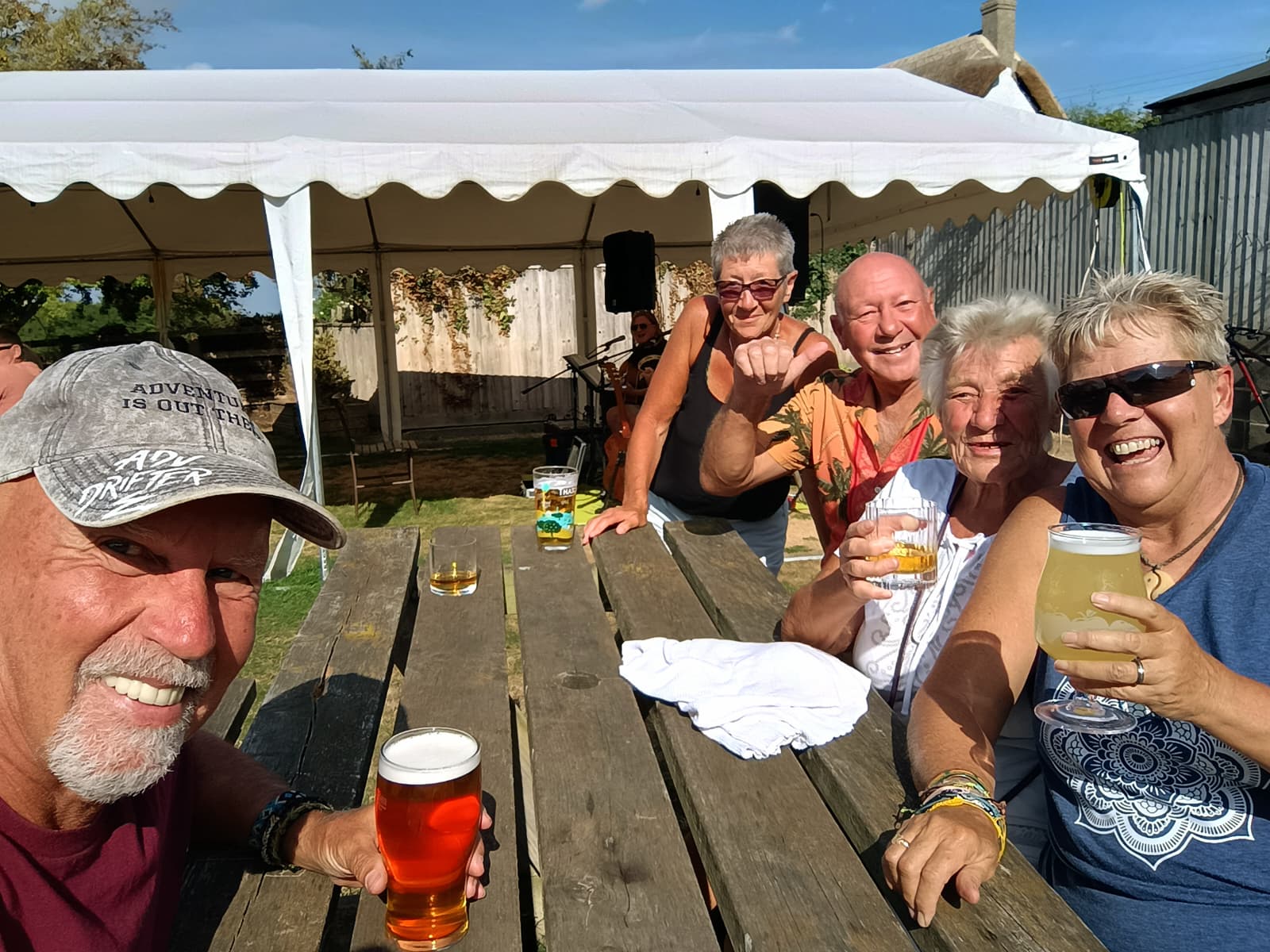 After a bit, a table at a nearby pub opened up. We moved to the outdoor seating to continue enjoying the warm sunny day. There were eight in our group. Our hosts, Charlie and Linda. Their son Ashly and his wife Caroline. Friends David and Emy from Georgia, USA, and us. Later int eh day I returned to the motorcycle and expected to see a ticket attached. There wasn’t one. Seems the festive mood even went to the traffic enforcement folks.